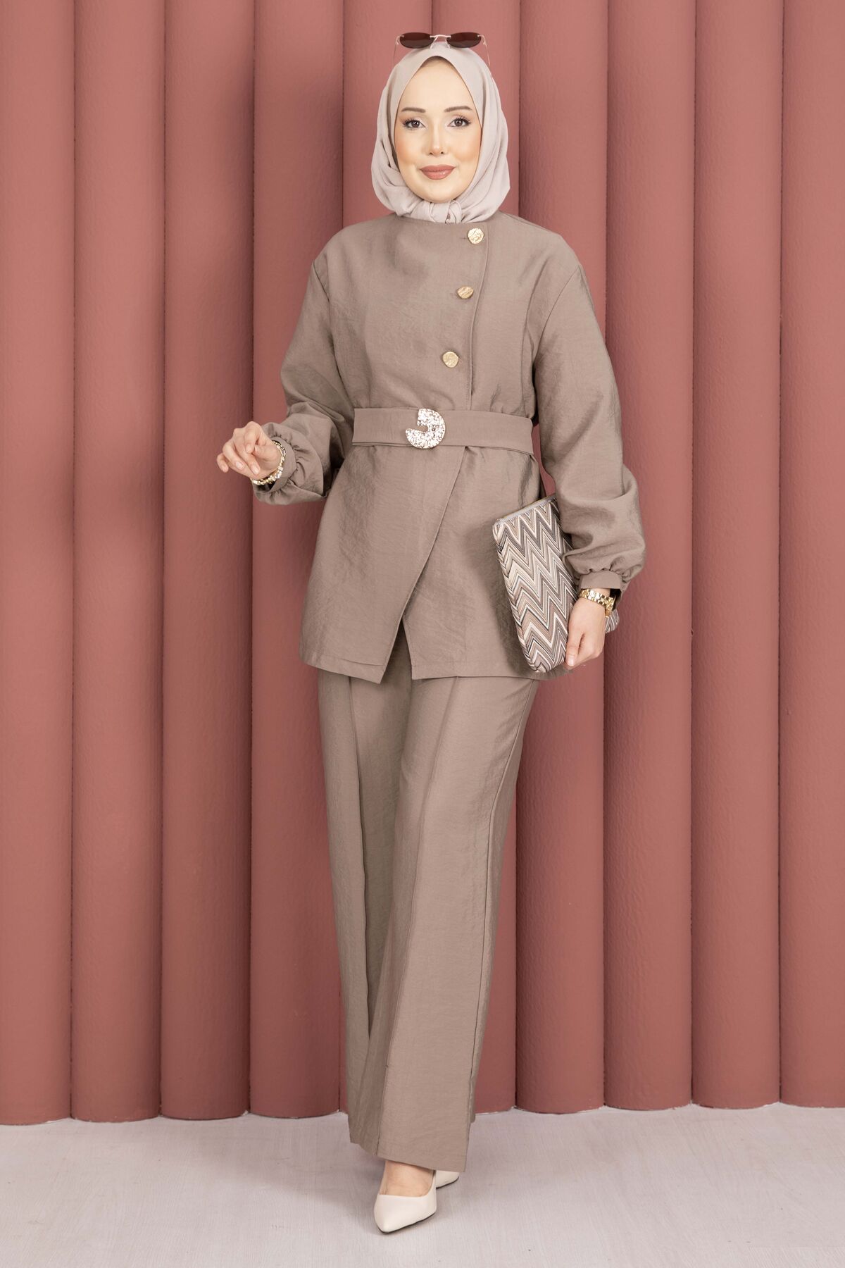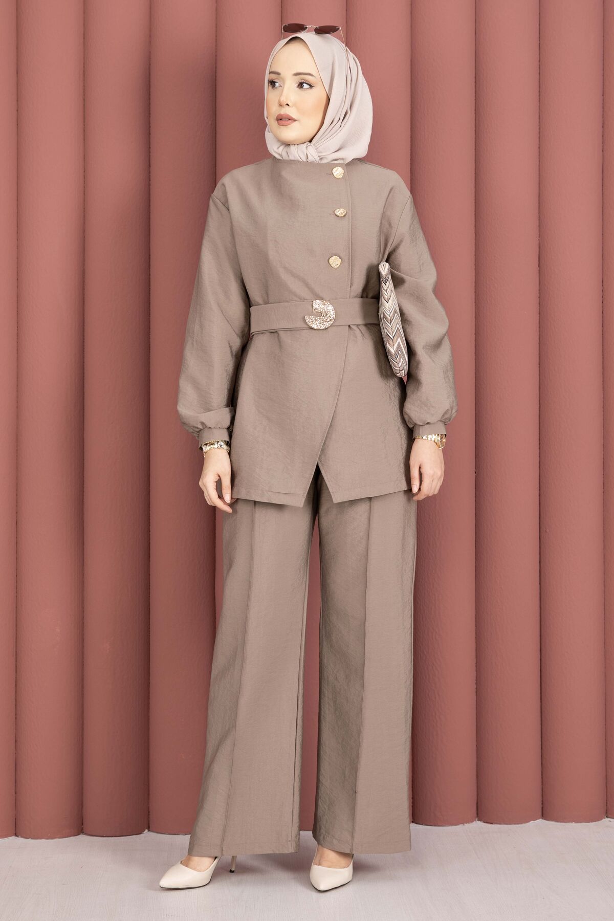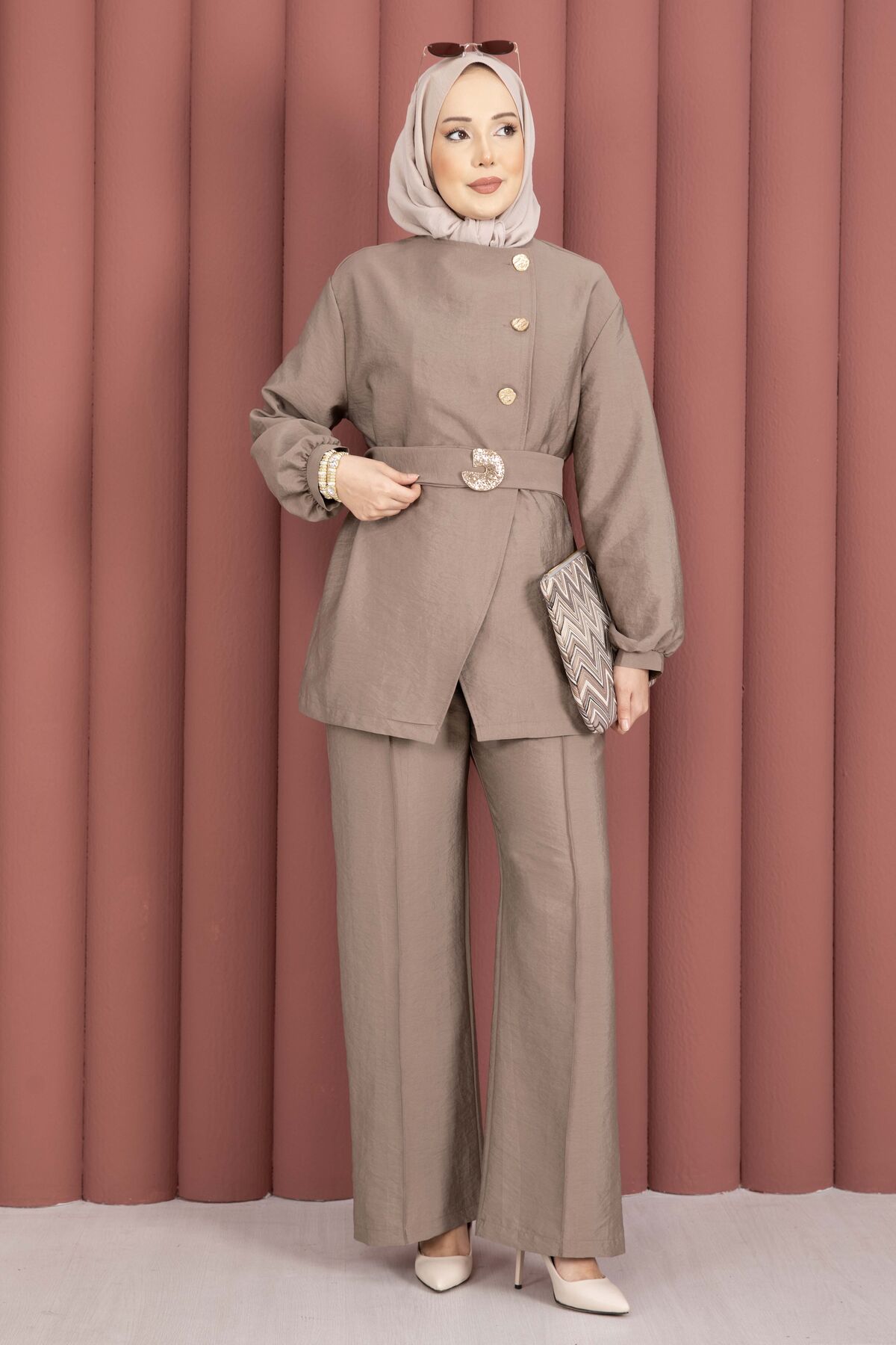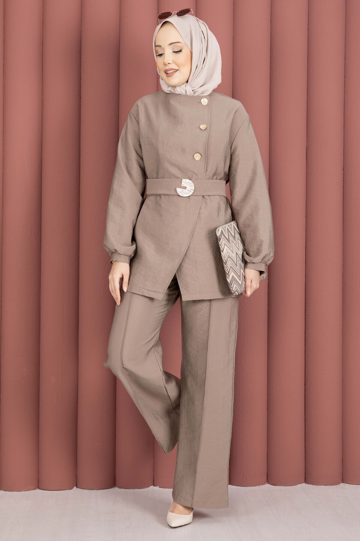 Tasarım Gold Düğmeli Kemerli İkili Takım Vizon