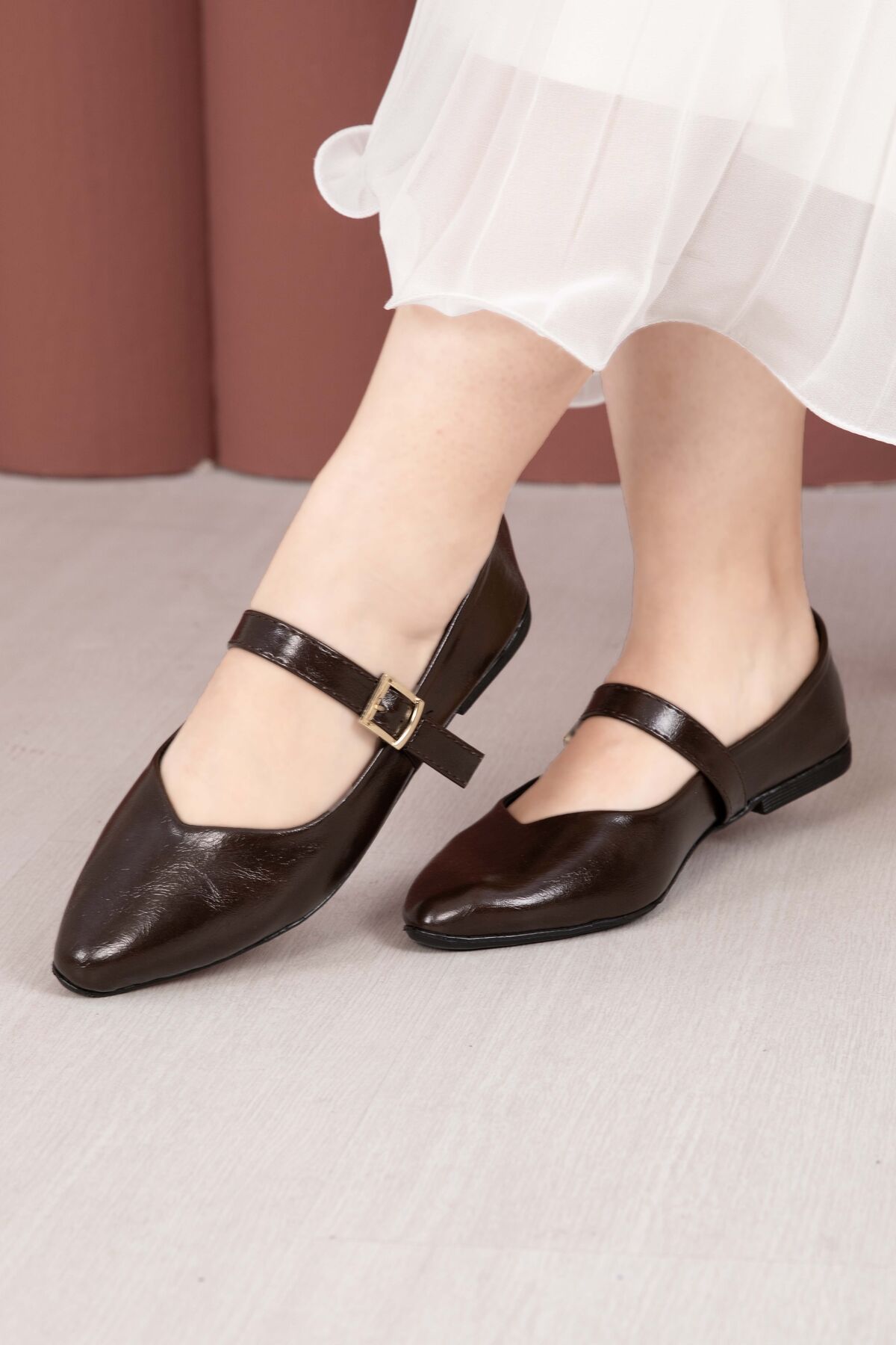 Tokalı Bant Detaylı Mary Jane Babet Ayakkabı Kahve