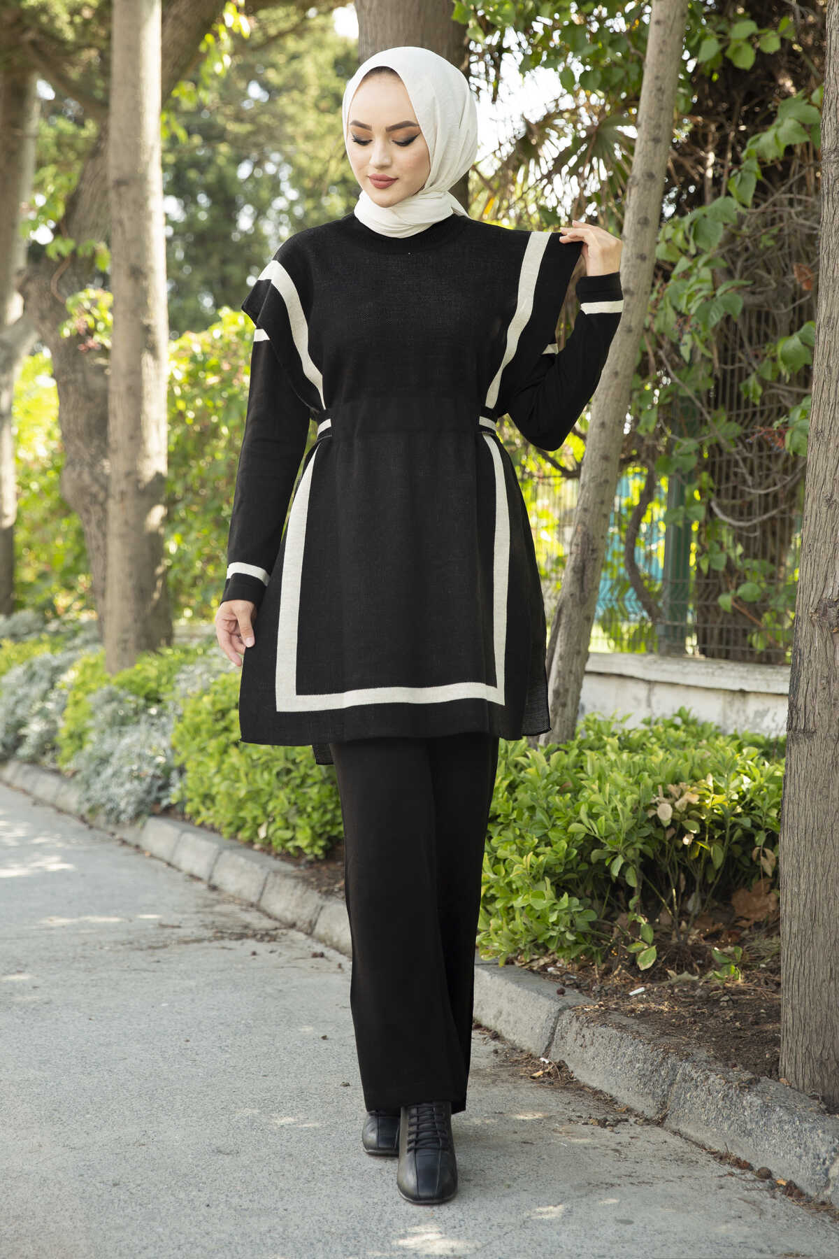 - Ürün mevsimliktir. Ürün Sonbahar-Kış mevsimlerinde kullanılabilir. Ürün üç parçadan oluşmaktadır. Üsteki parça ile iç tuniği ayrı ayrı kullanabilirsiniz birleşik değildir. Kuşak isteğe göre kullanılmayabilir. Süveter de kuşak için tünel yapılmıştır, süveter arkalı önlü kullanılabilir eşittir. Pantolon belden kalın lastiklidir. Takım cepsiz, bisiklet yakadır. Ürün standart beden olup 36-38-40-42 bedenlere uyumlu Üçlü Triko Takımdır