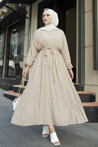 Kemerli Çıtır Desen Elbise 120NY-5327 Pudra