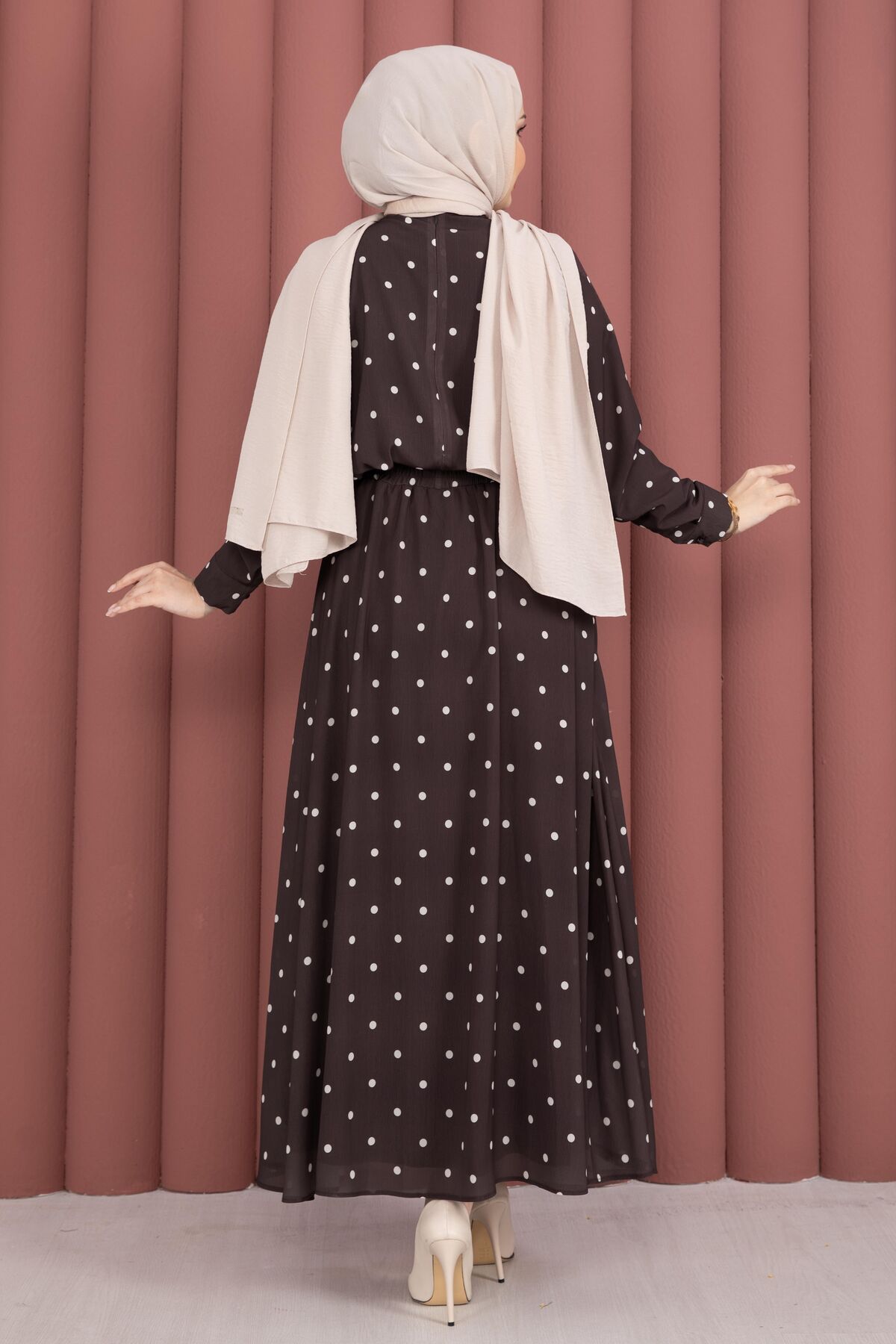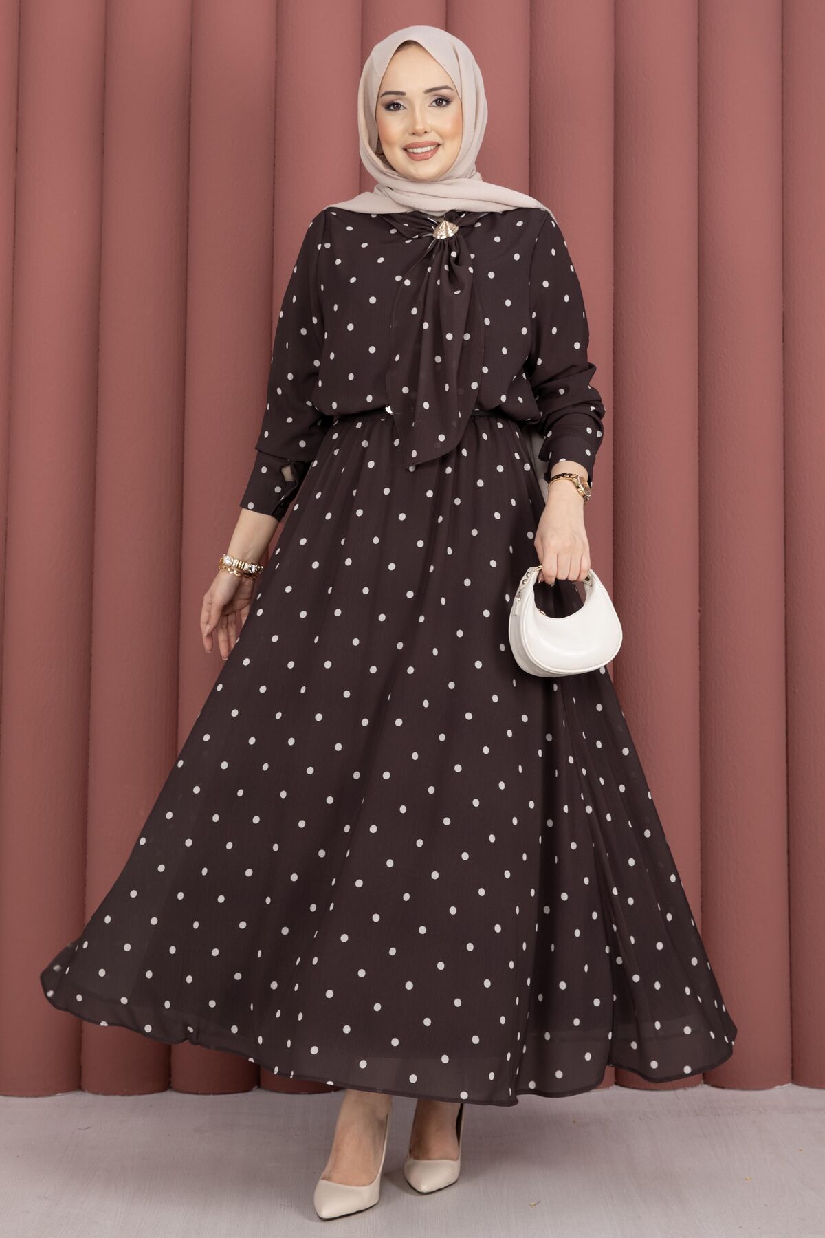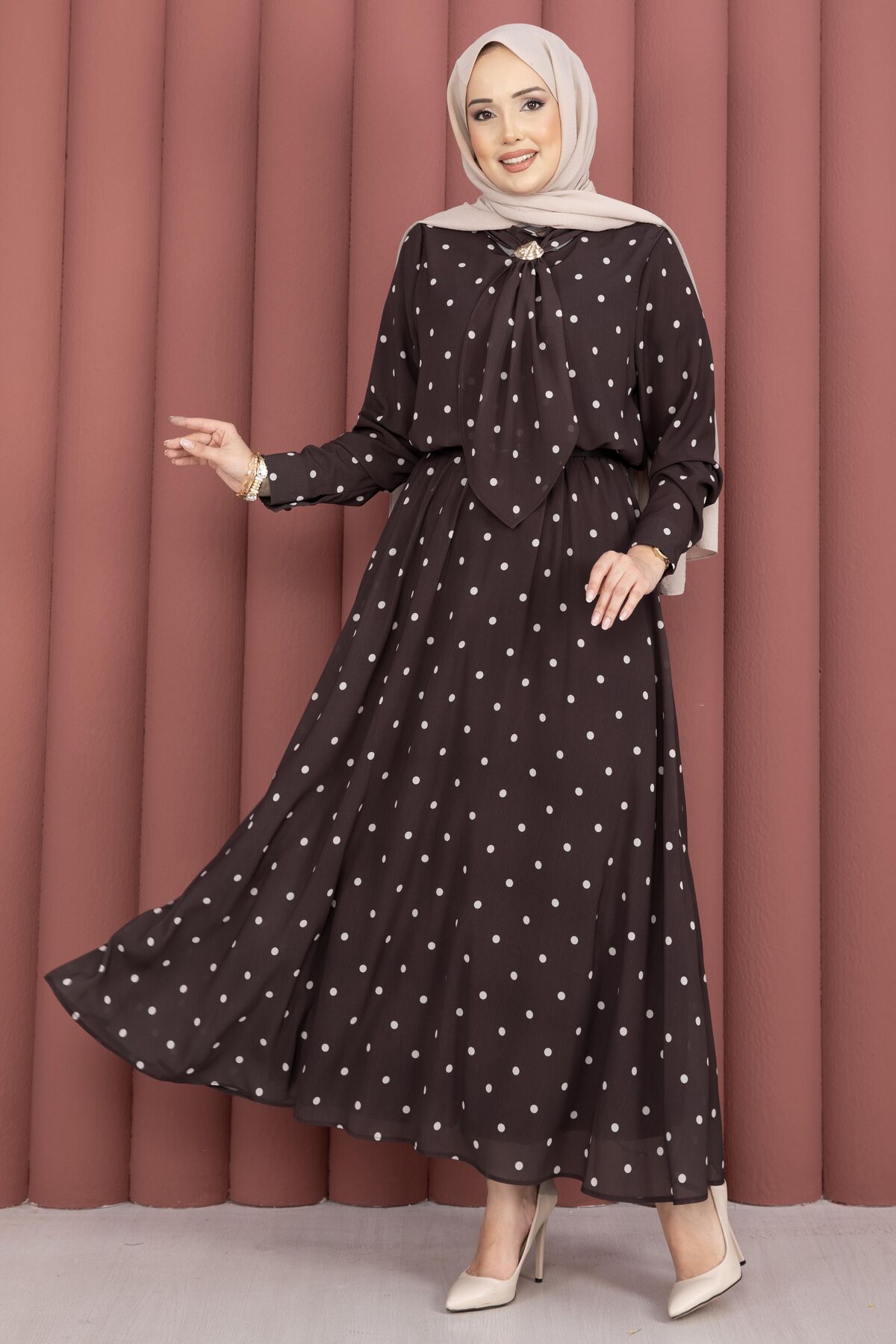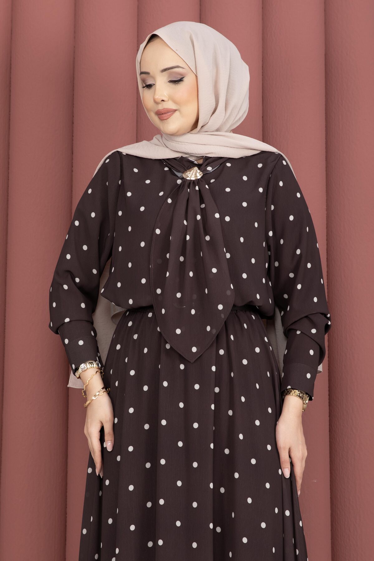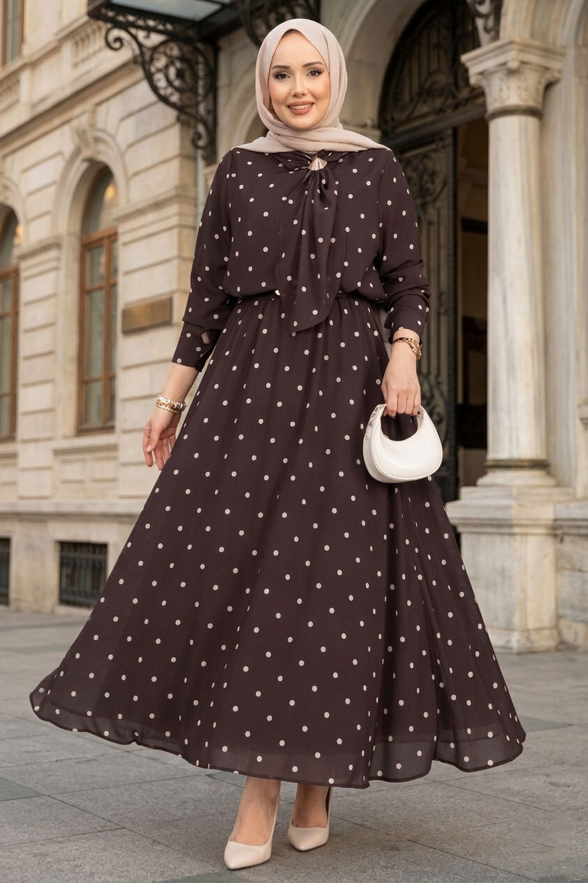 Yaka Fularlı Puantiyeli Etekli Takım Kahve