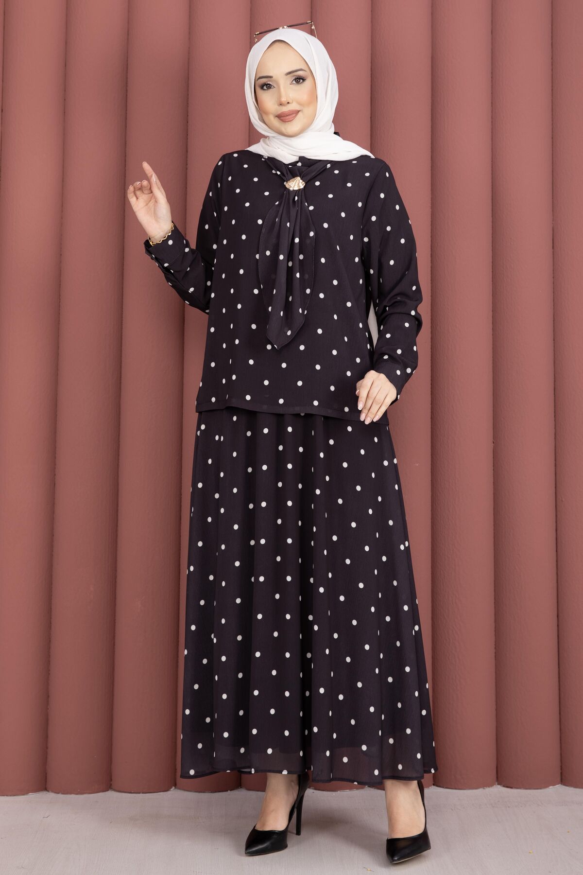 Yaka Fularlı Puantiyeli Etekli Takım Siyah