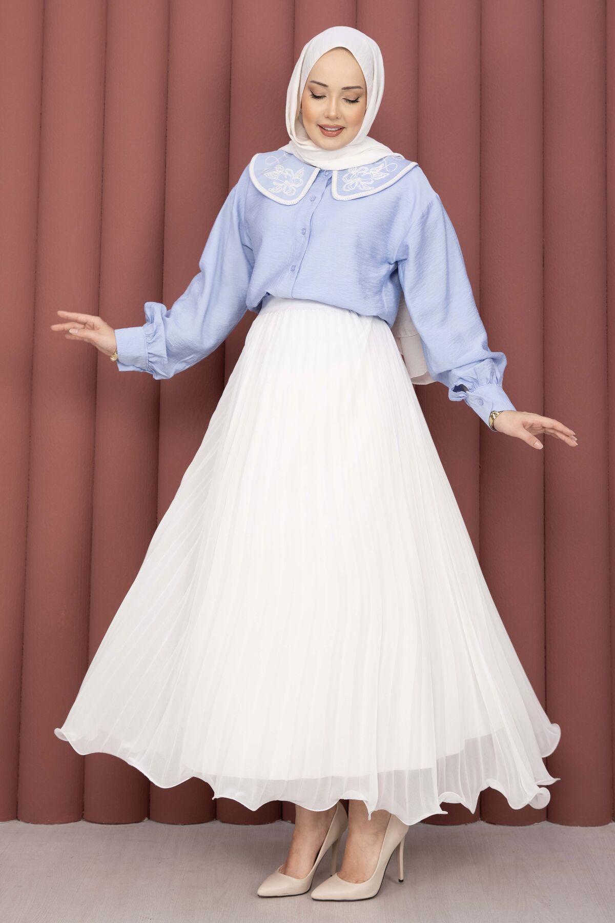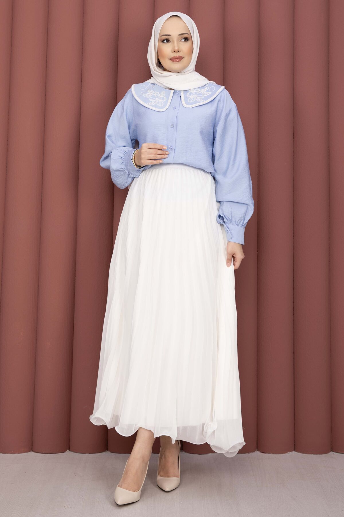 Yaka Nakışlı Etek Üstü Gömlek Bebe Mavisi