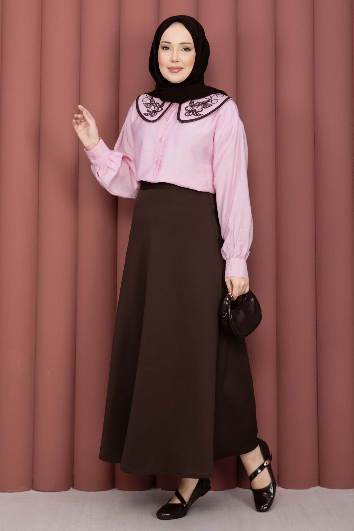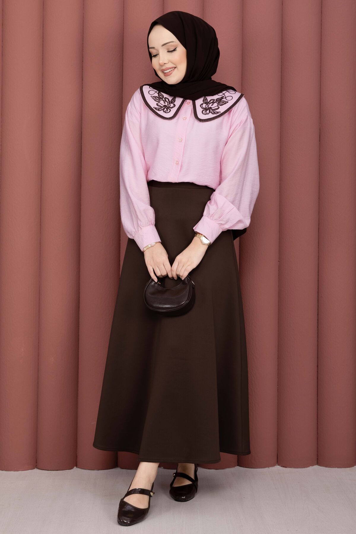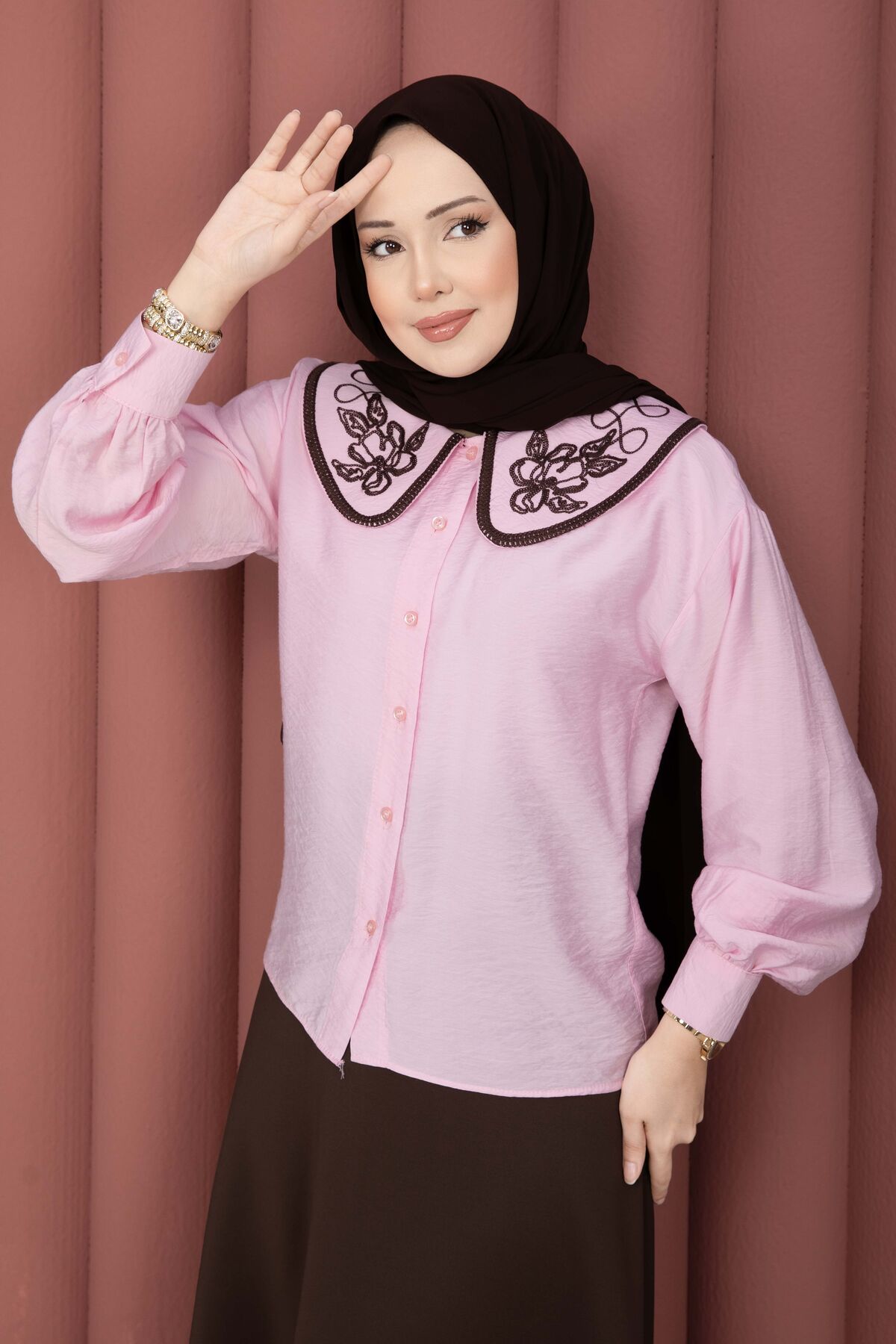 Yaka Nakışlı Etek Üstü Gömlek Pembe