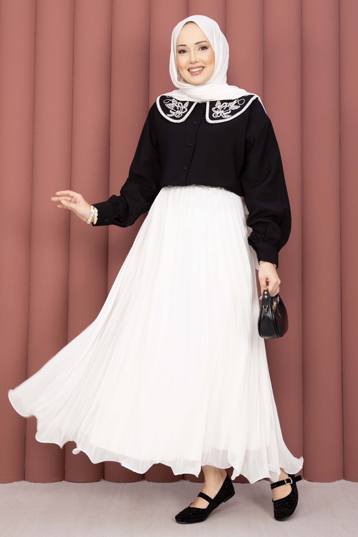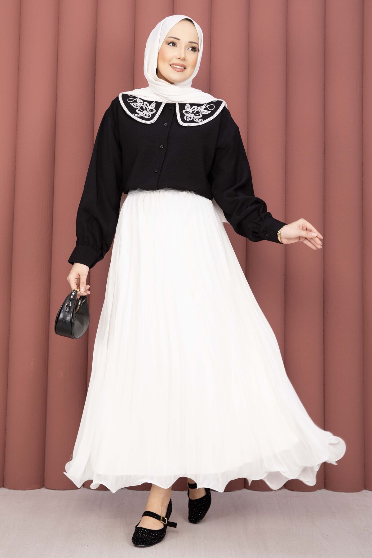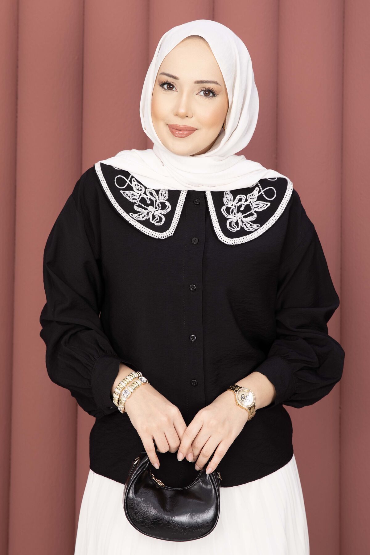 Yaka Nakışlı Etek Üstü Gömlek Siyah