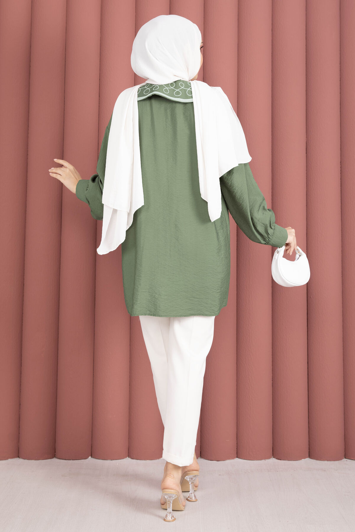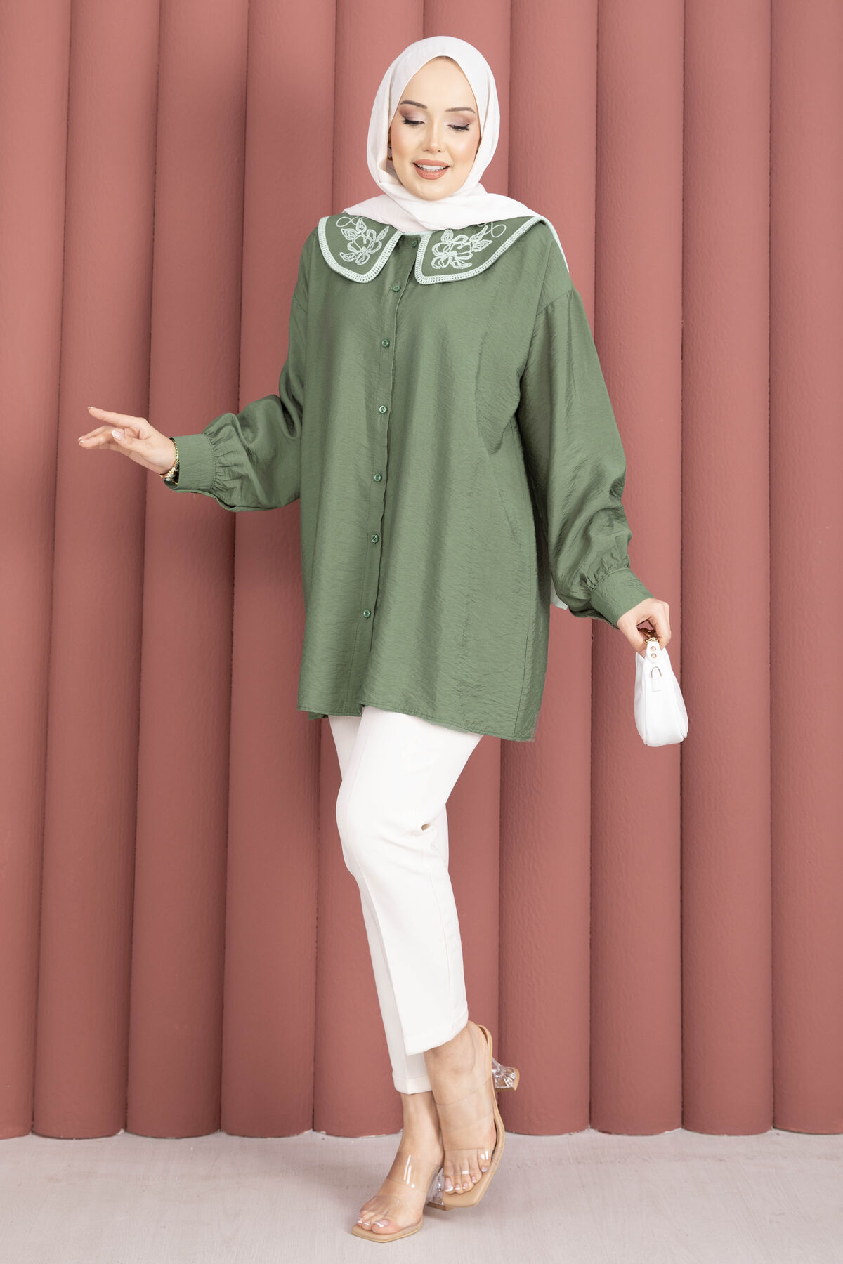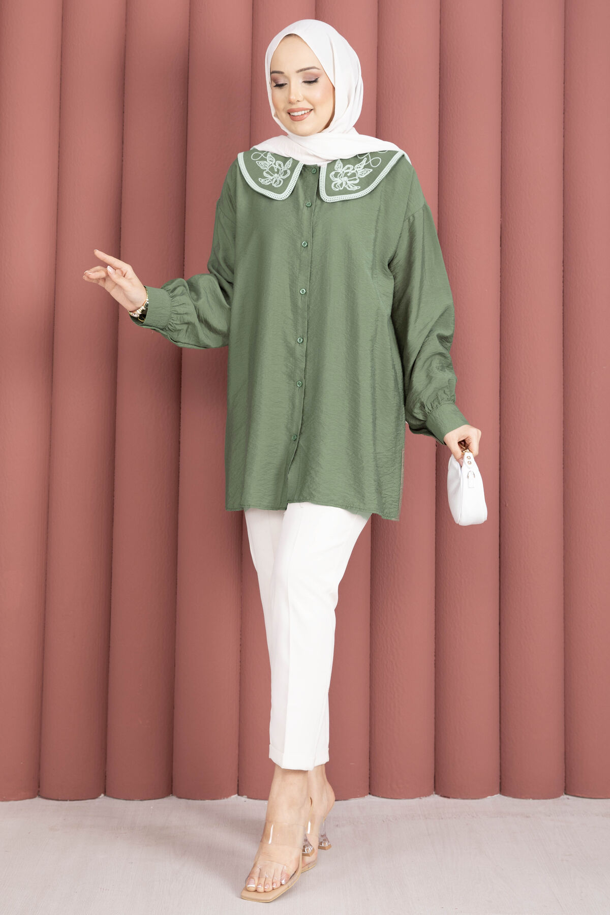 Yaka Nakışlı Tesettür Tunik Haki