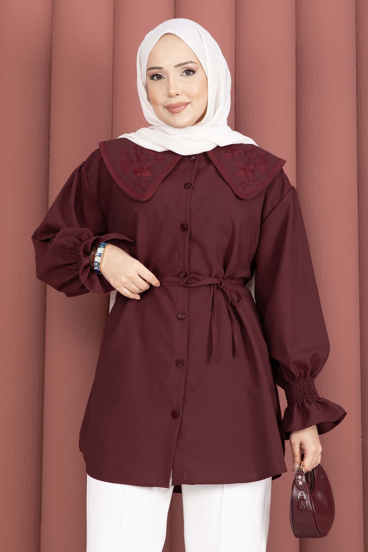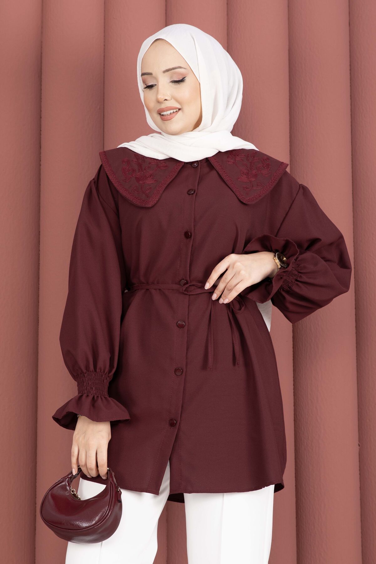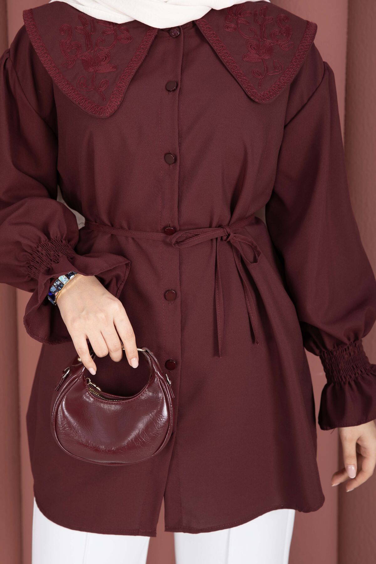 Yakası Nakış Detaylı Beli Bağcıklı Tunik Bordo