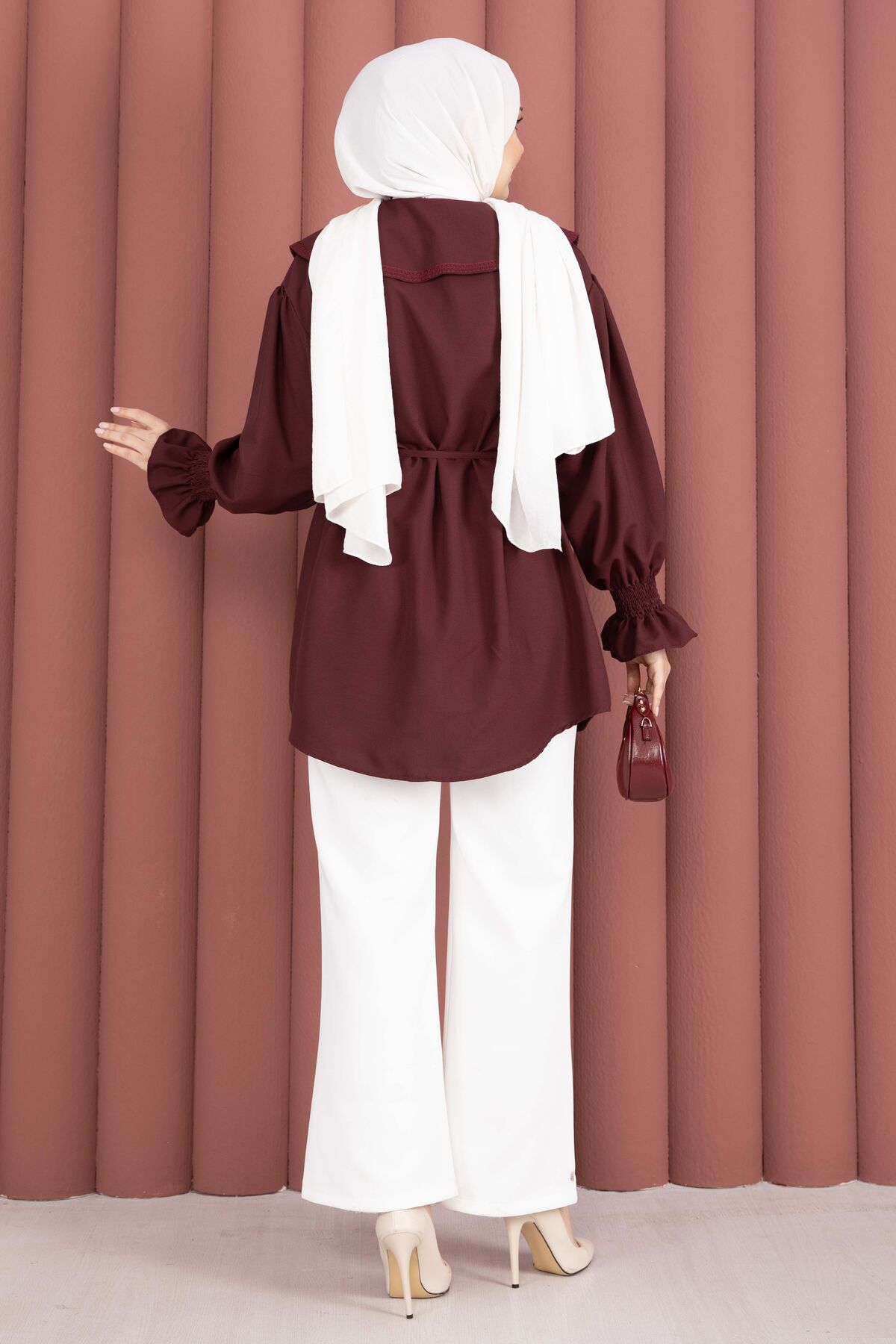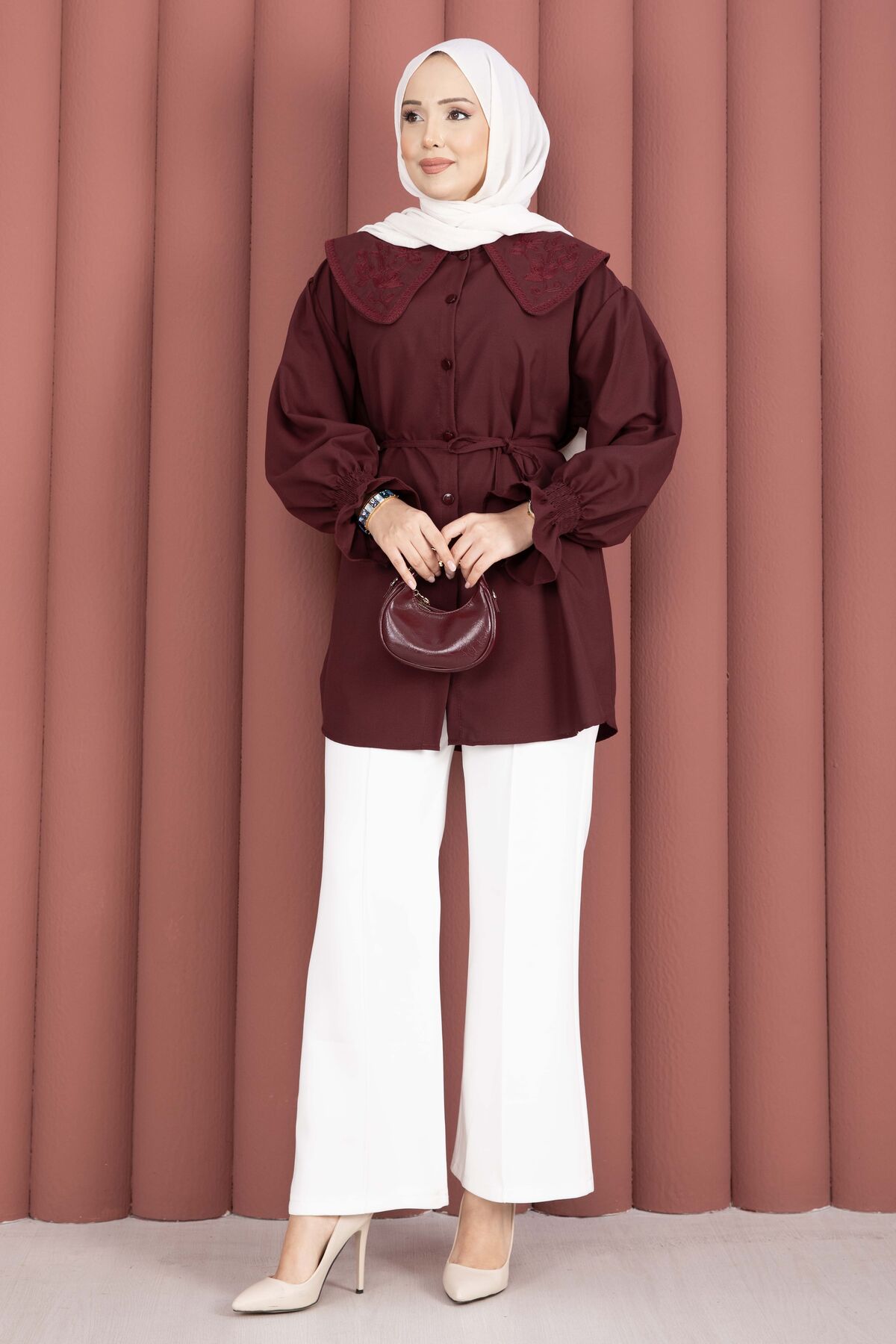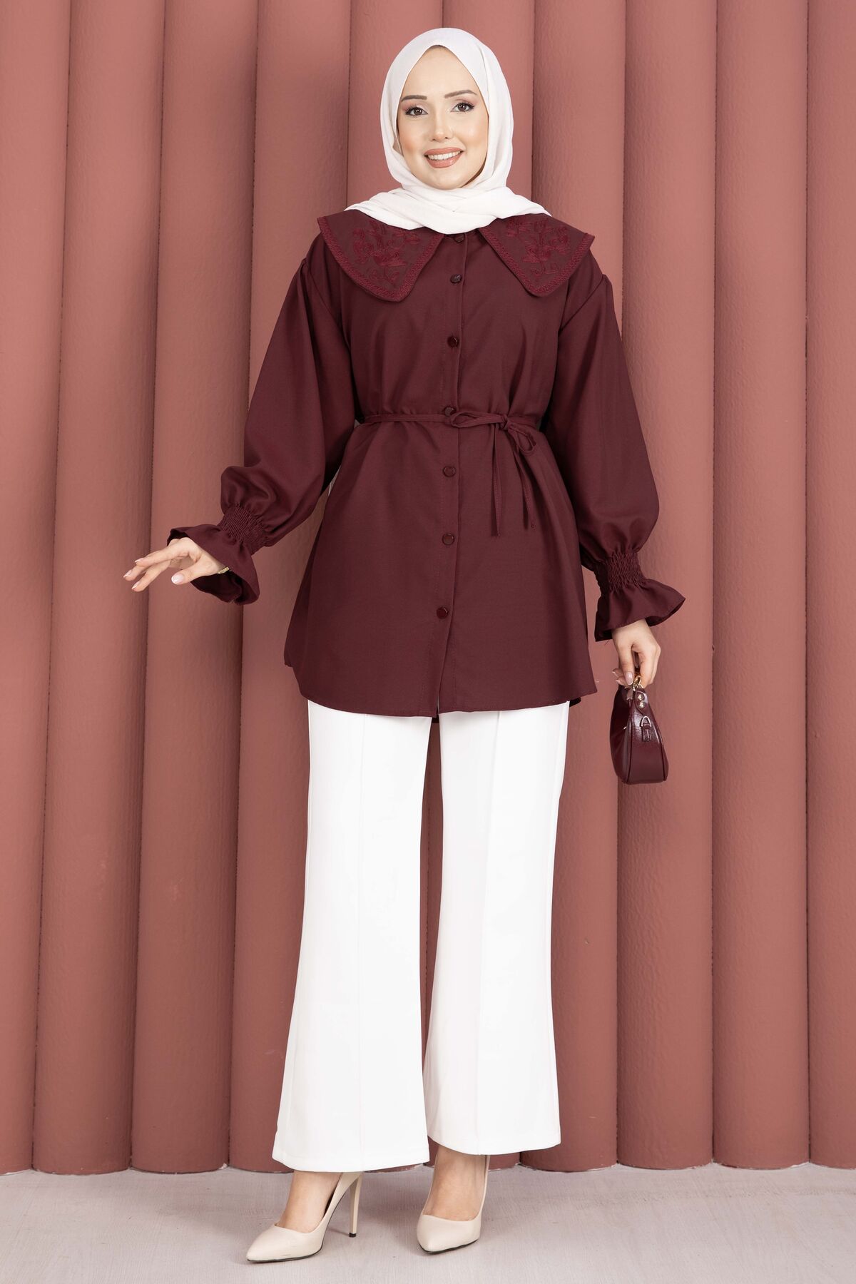 Yakası Nakış Detaylı Beli Bağcıklı Tunik Bordo