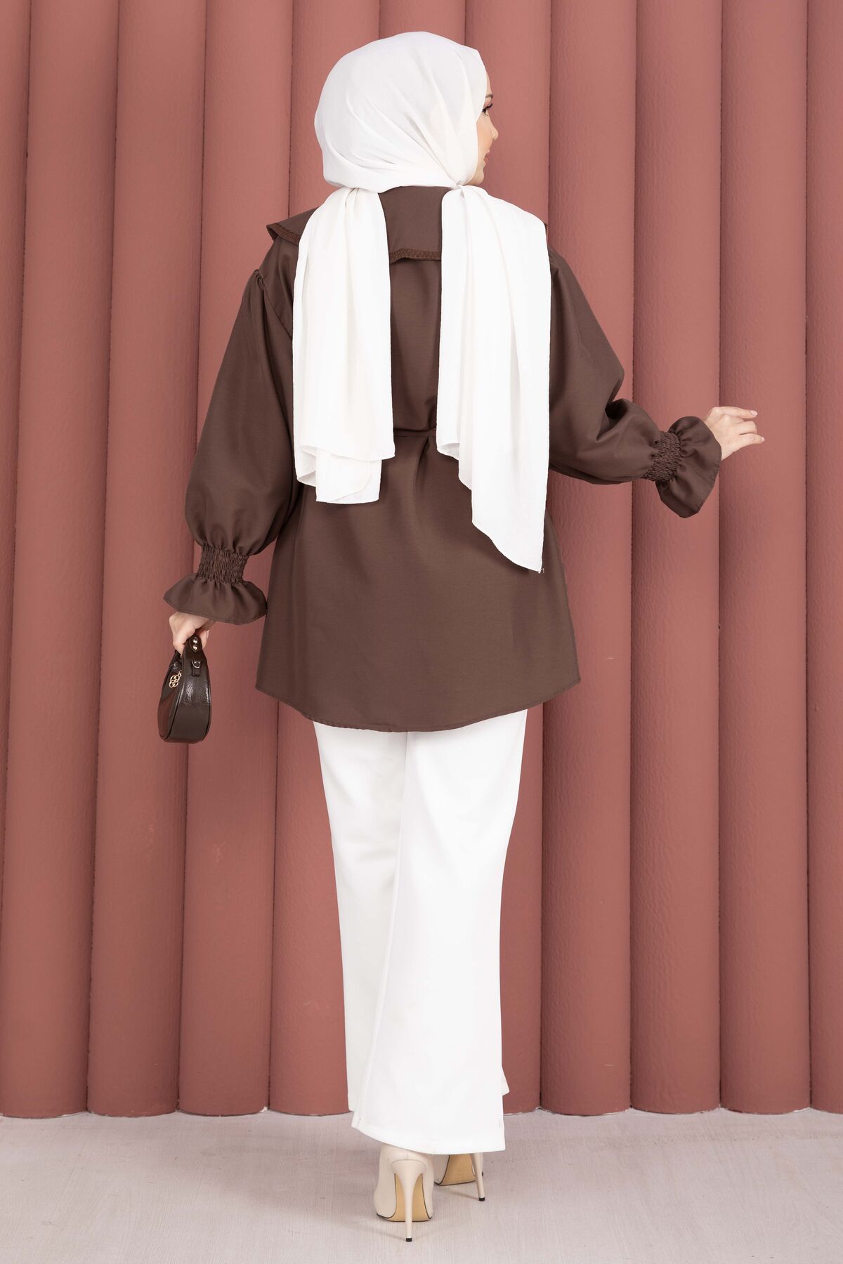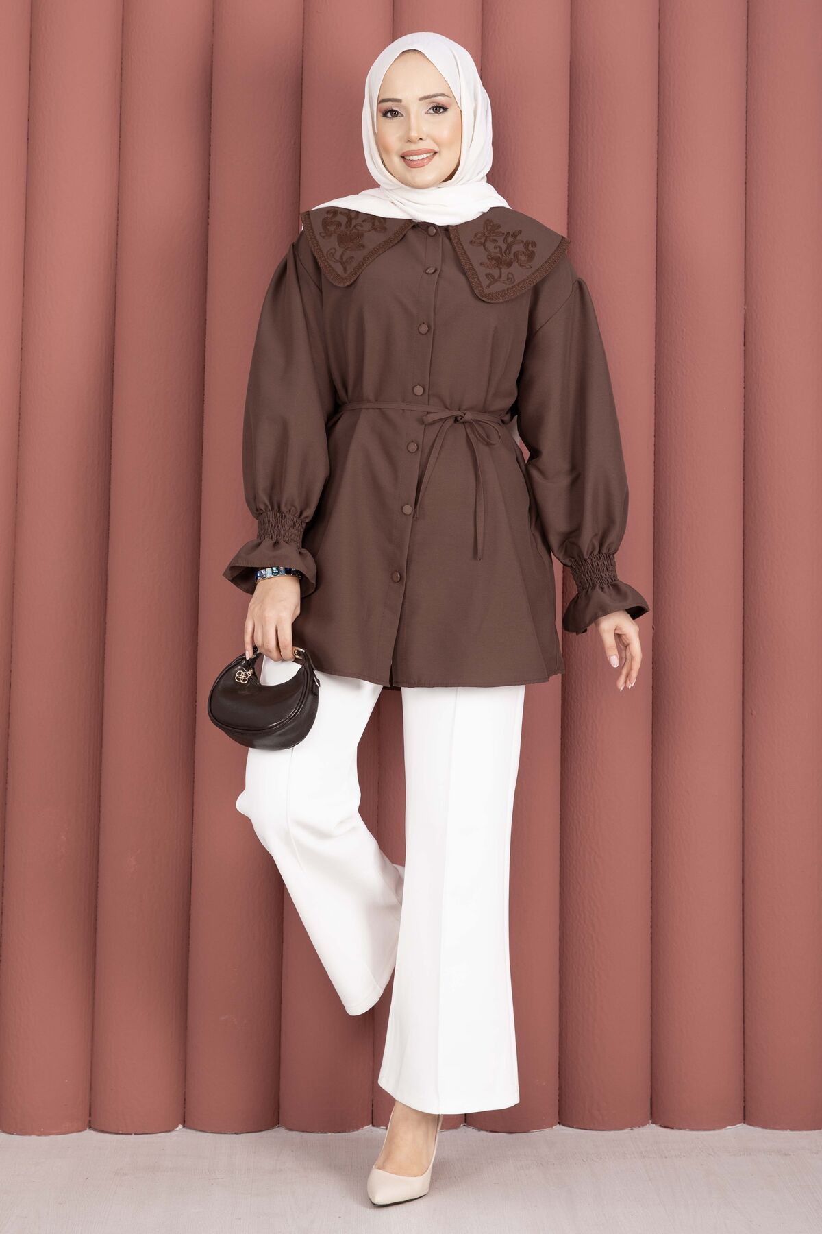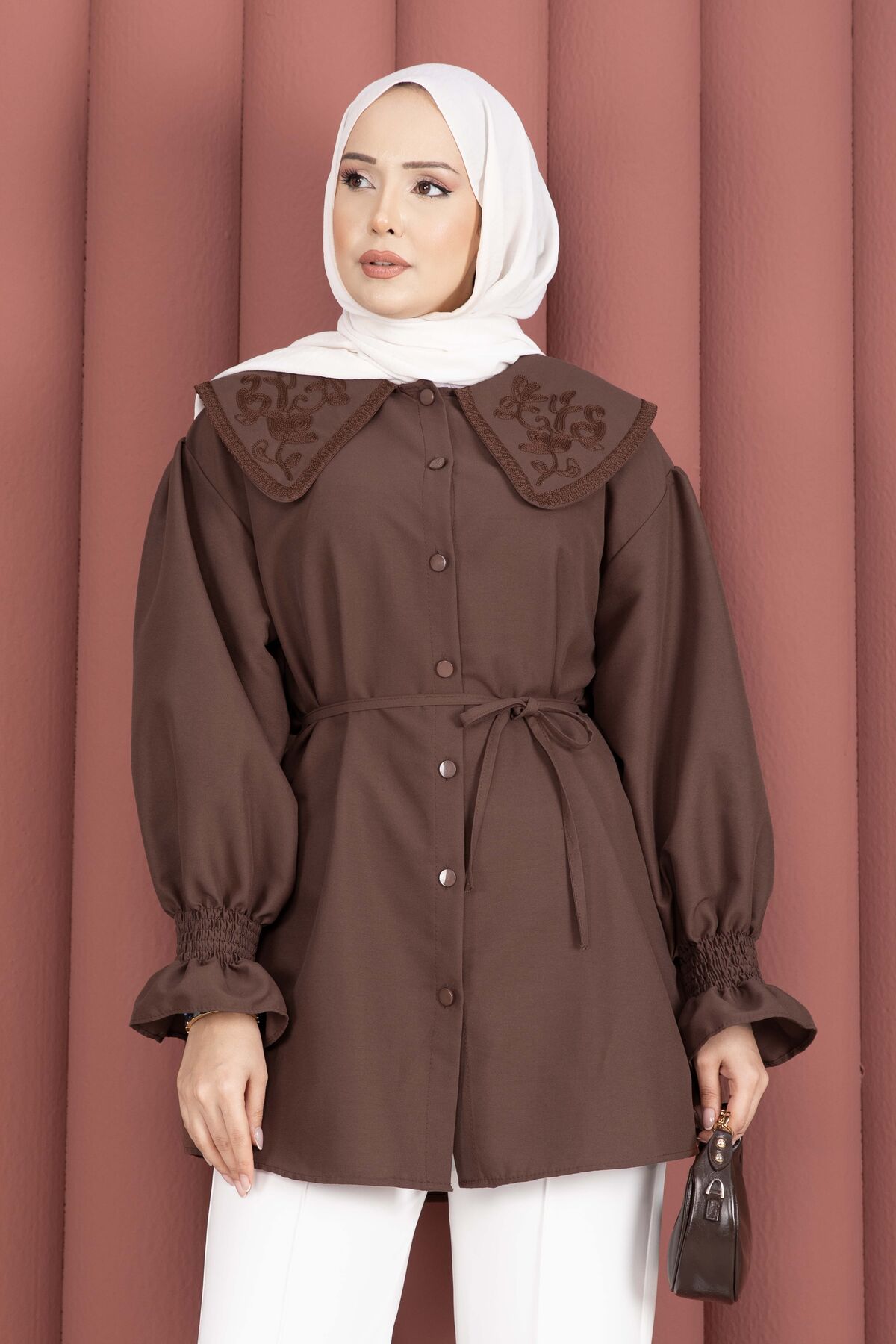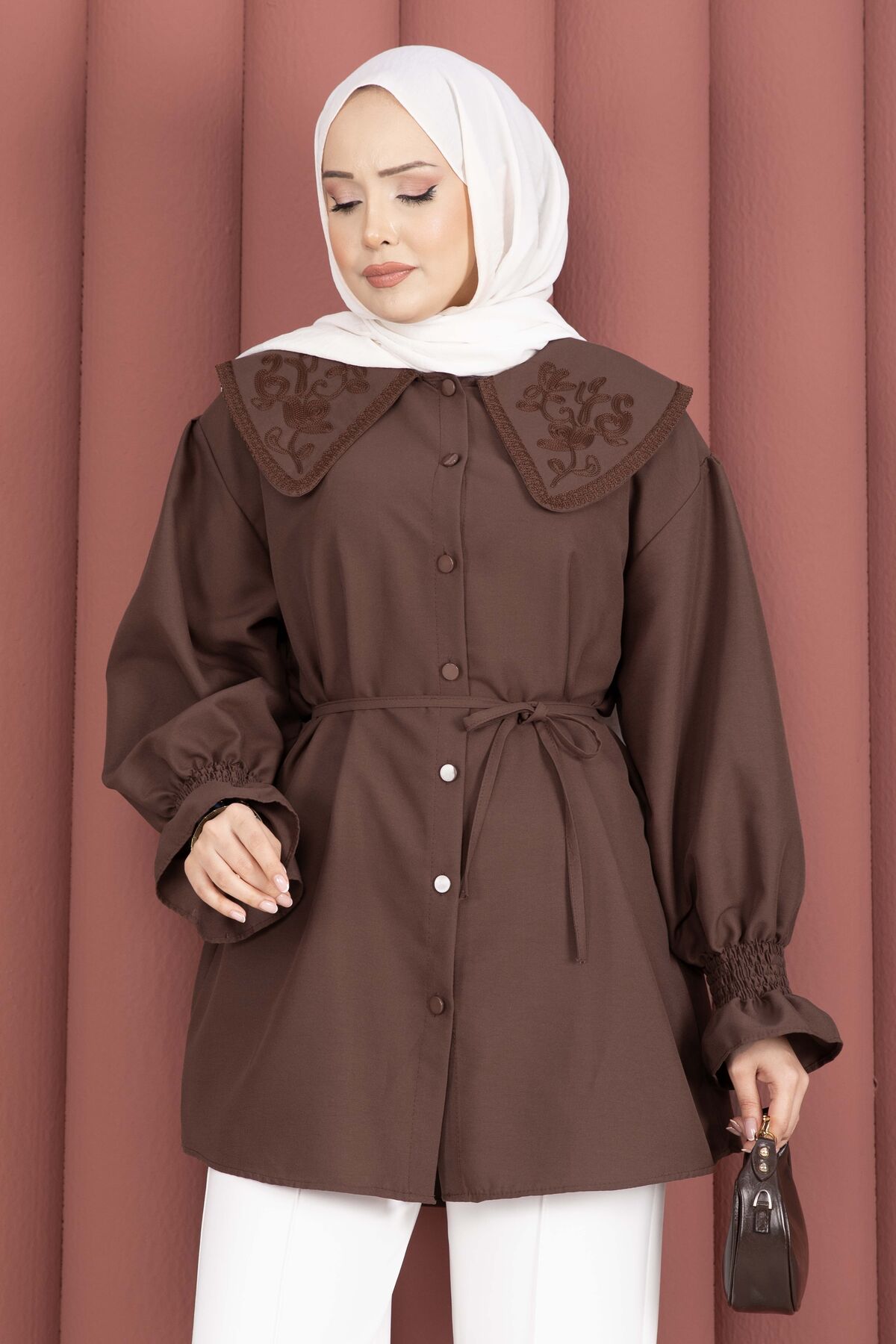 Yakası Nakış Detaylı Beli Bağcıklı Tunik Kahve