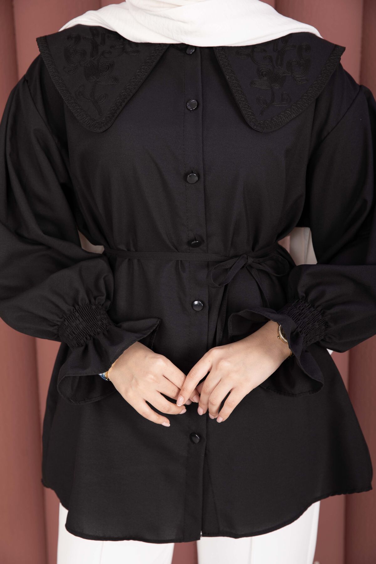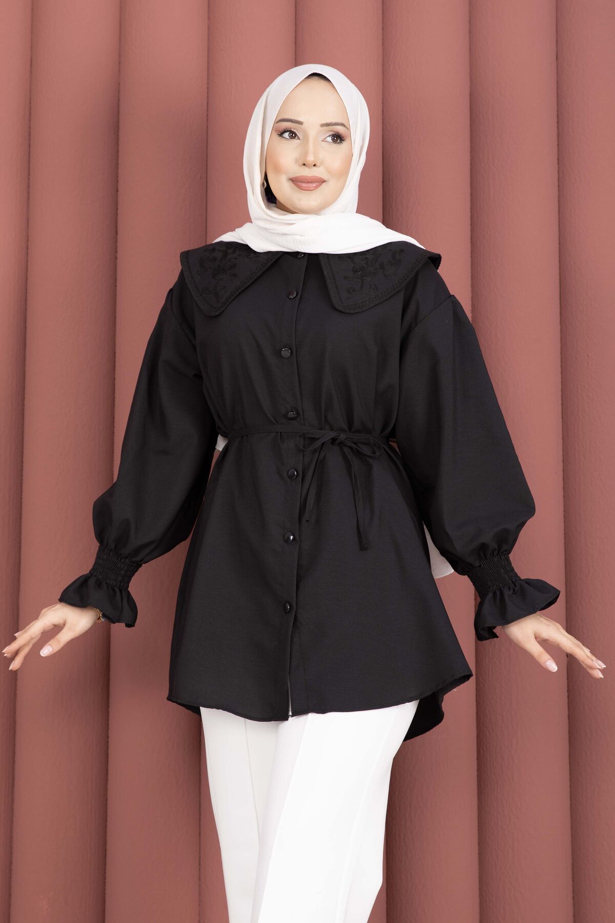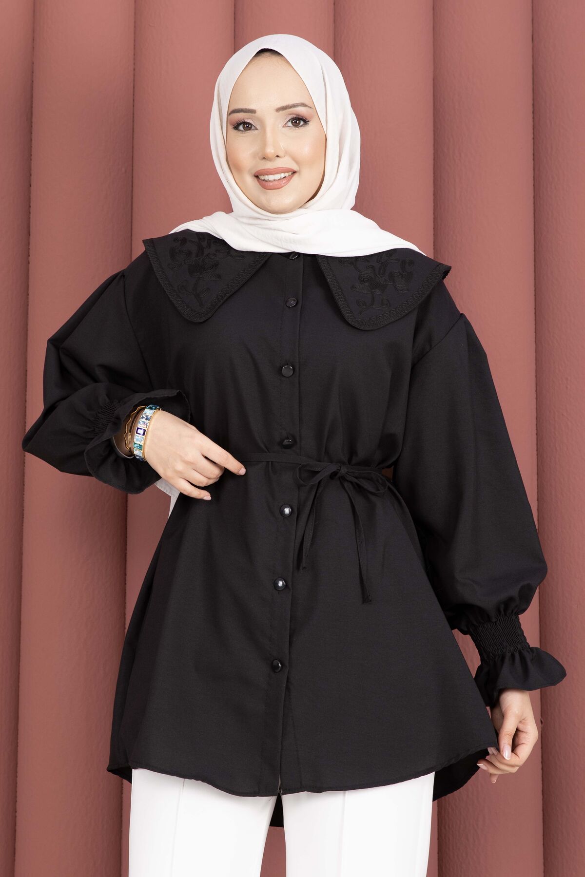 Zarif yaka nakış detaylarıyla şıklığı tamamlayan bu tunik, rahat kalıbı ve modern tasarımıyla günlük kombinlerin vazgeçilmezi olacak. Önden boydan düğmeli yapısı sayesinde hem kullanışlı hem de şık bir görünüm sunar. Beli seyyar kuşaklı modeliyle vücuda göre ayarlanabilir ve daha zarif bir duruş sağlar.