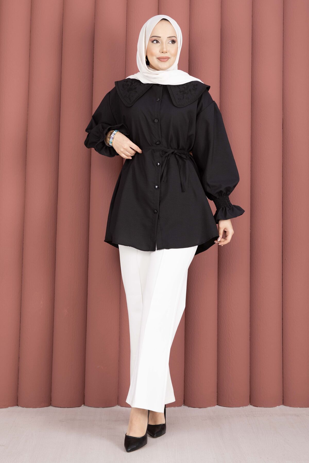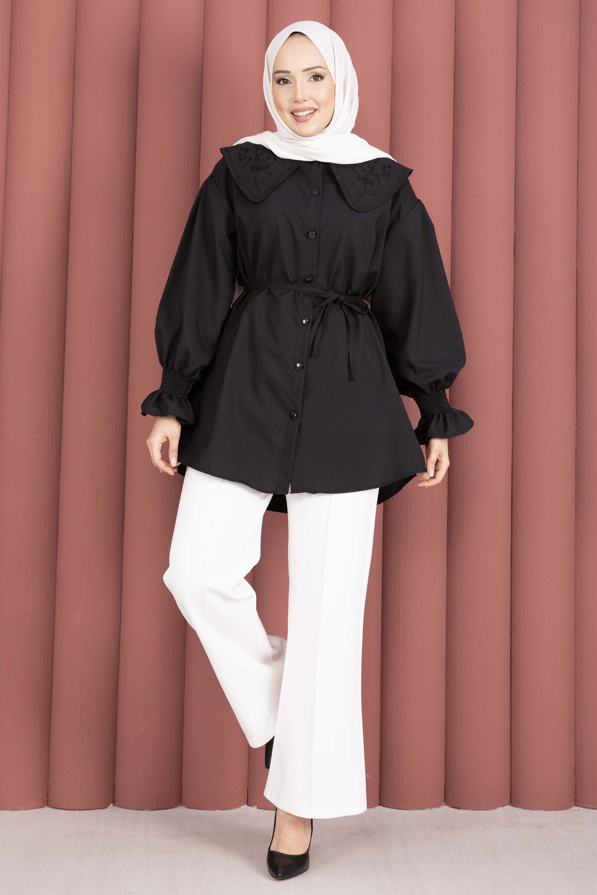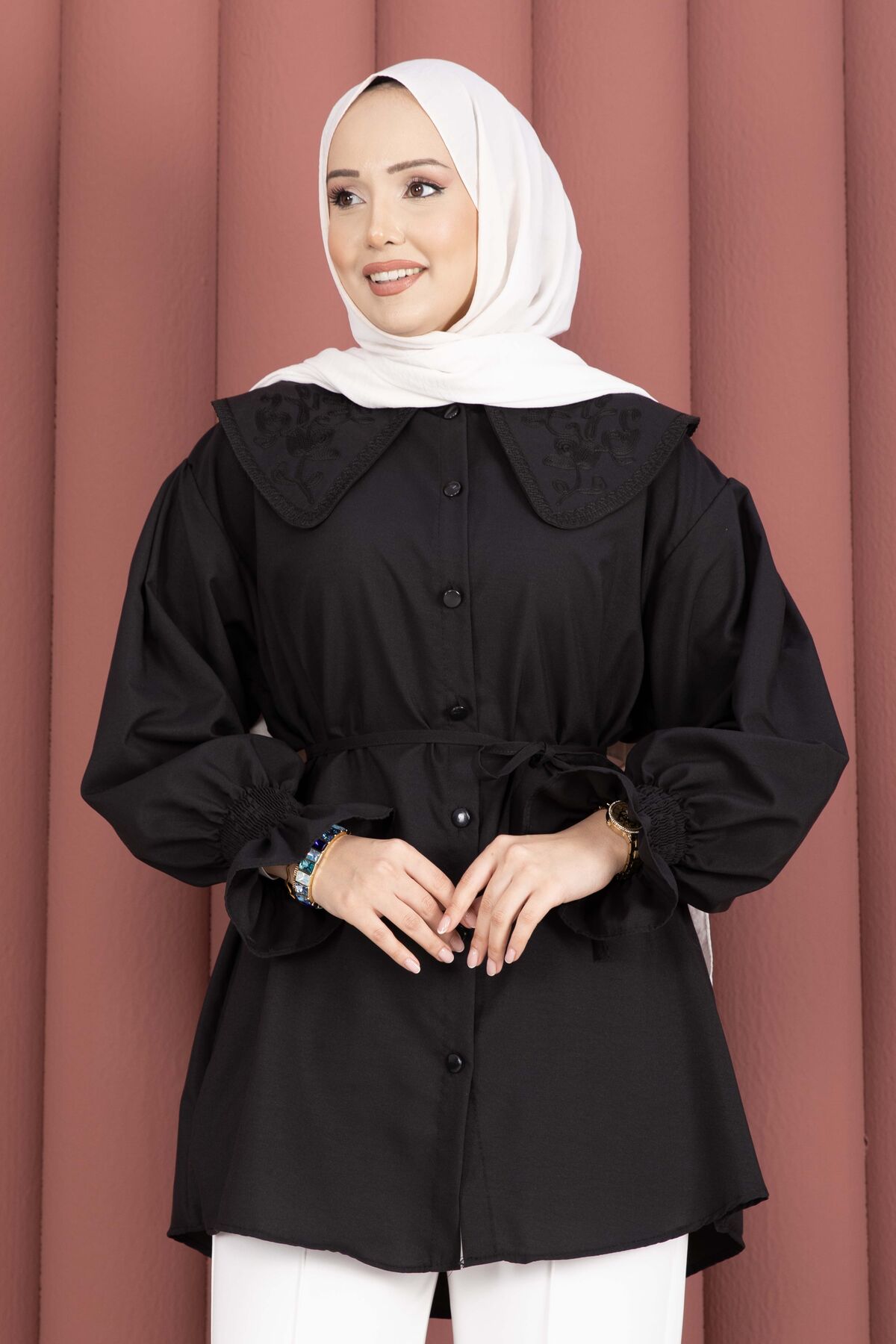 Zarif yaka nakış detaylarıyla şıklığı tamamlayan bu tunik, rahat kalıbı ve modern tasarımıyla günlük kombinlerin vazgeçilmezi olacak. Önden boydan düğmeli yapısı sayesinde hem kullanışlı hem de şık bir görünüm sunar. Beli seyyar kuşaklı modeliyle vücuda göre ayarlanabilir ve daha zarif bir duruş sağlar.