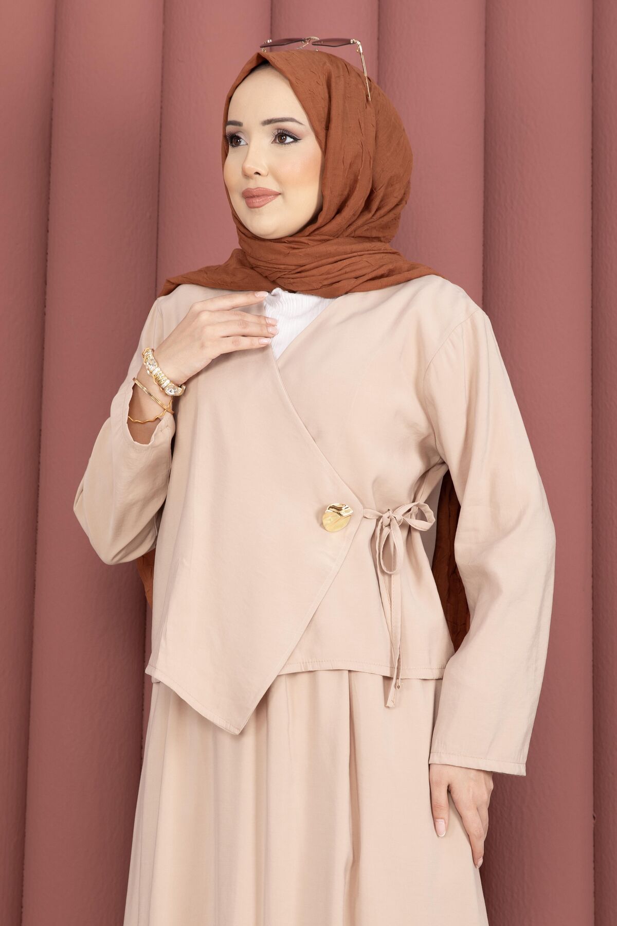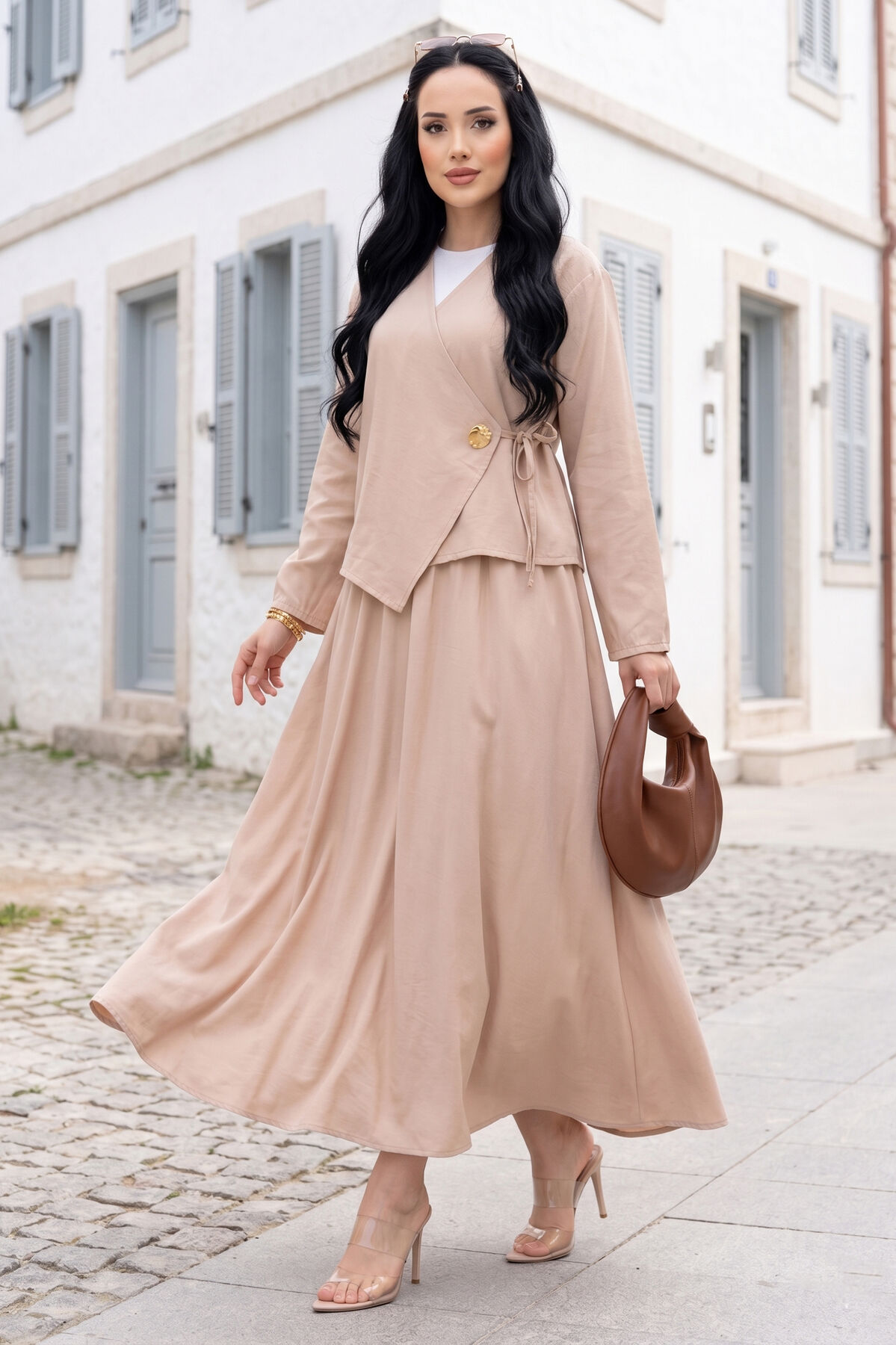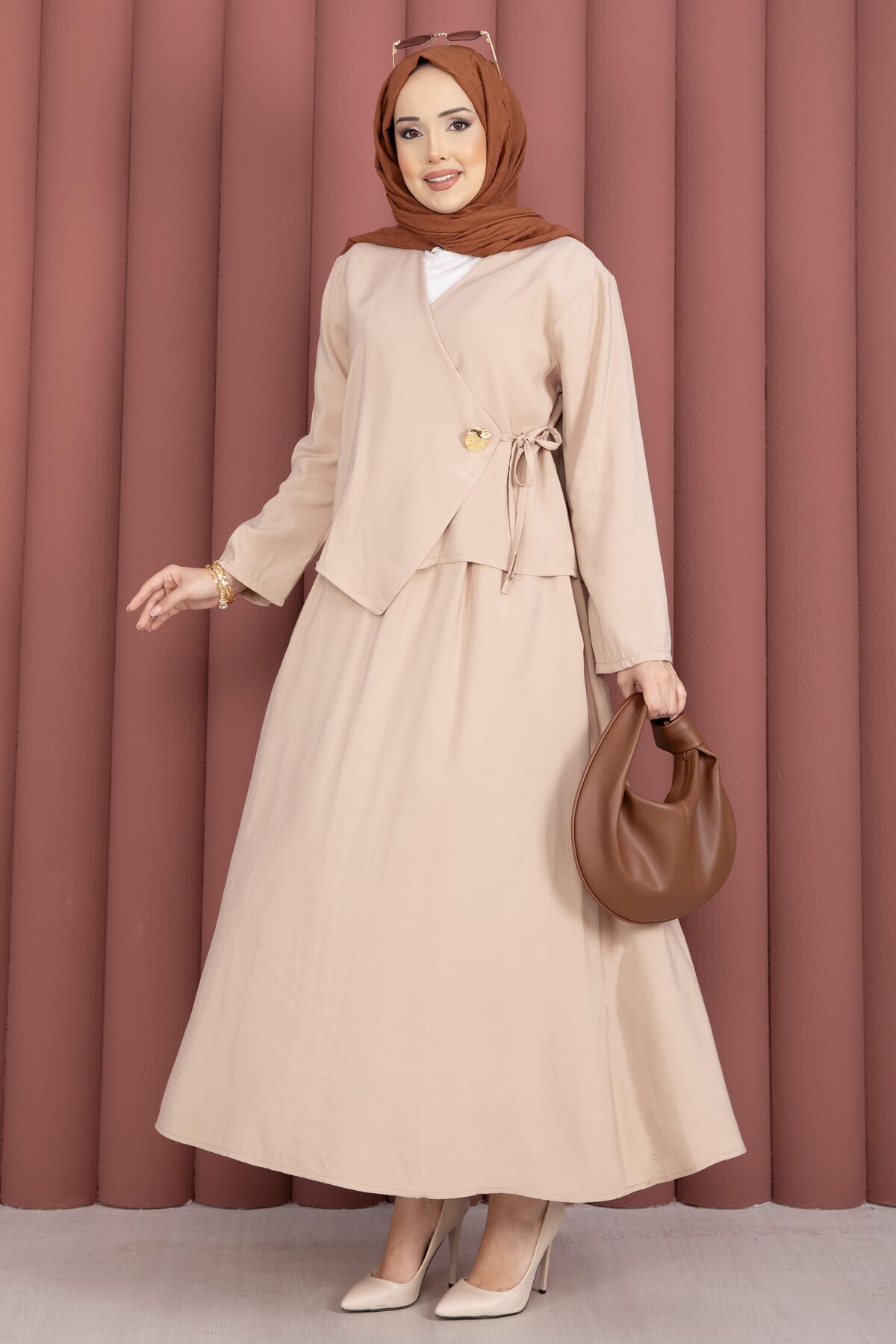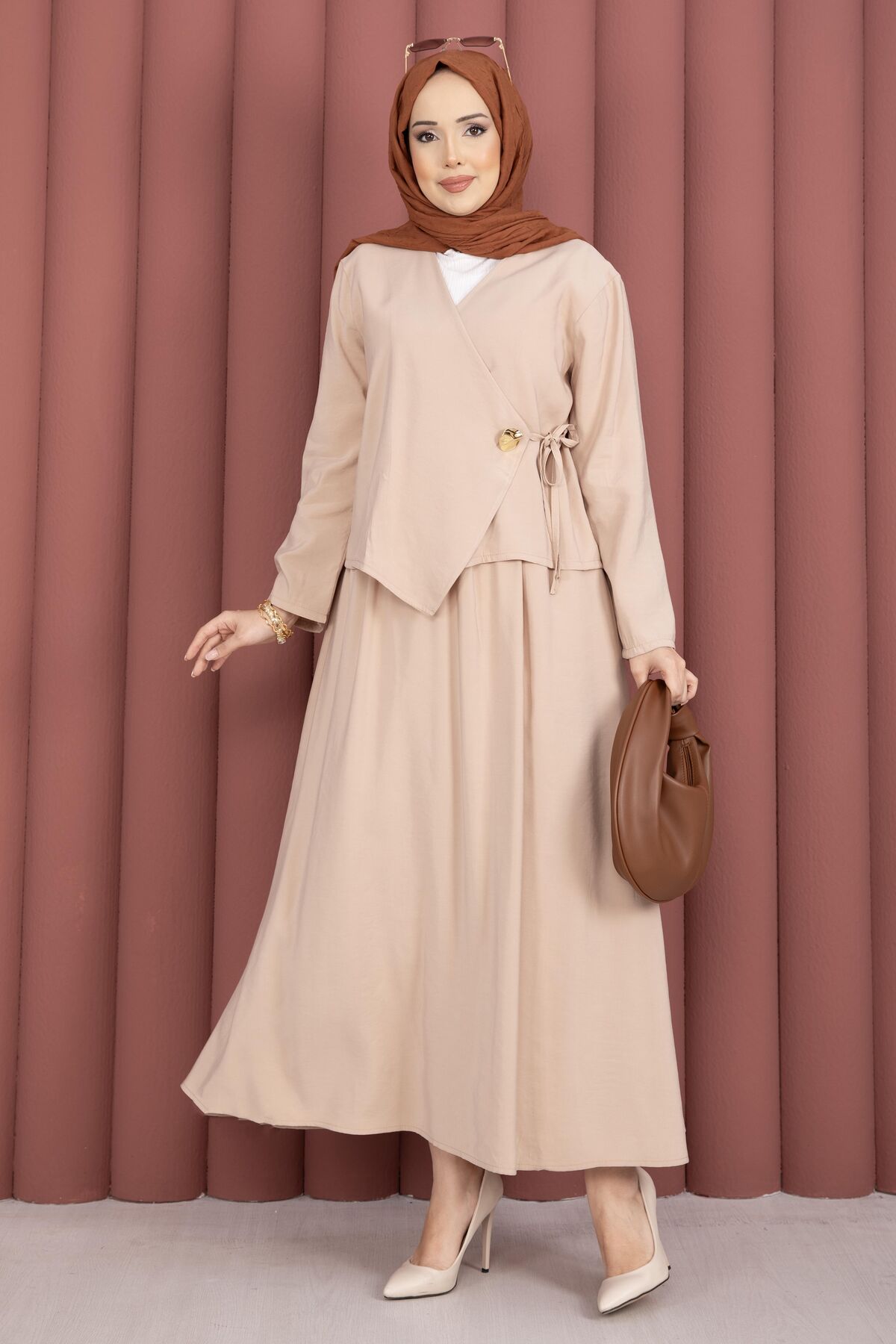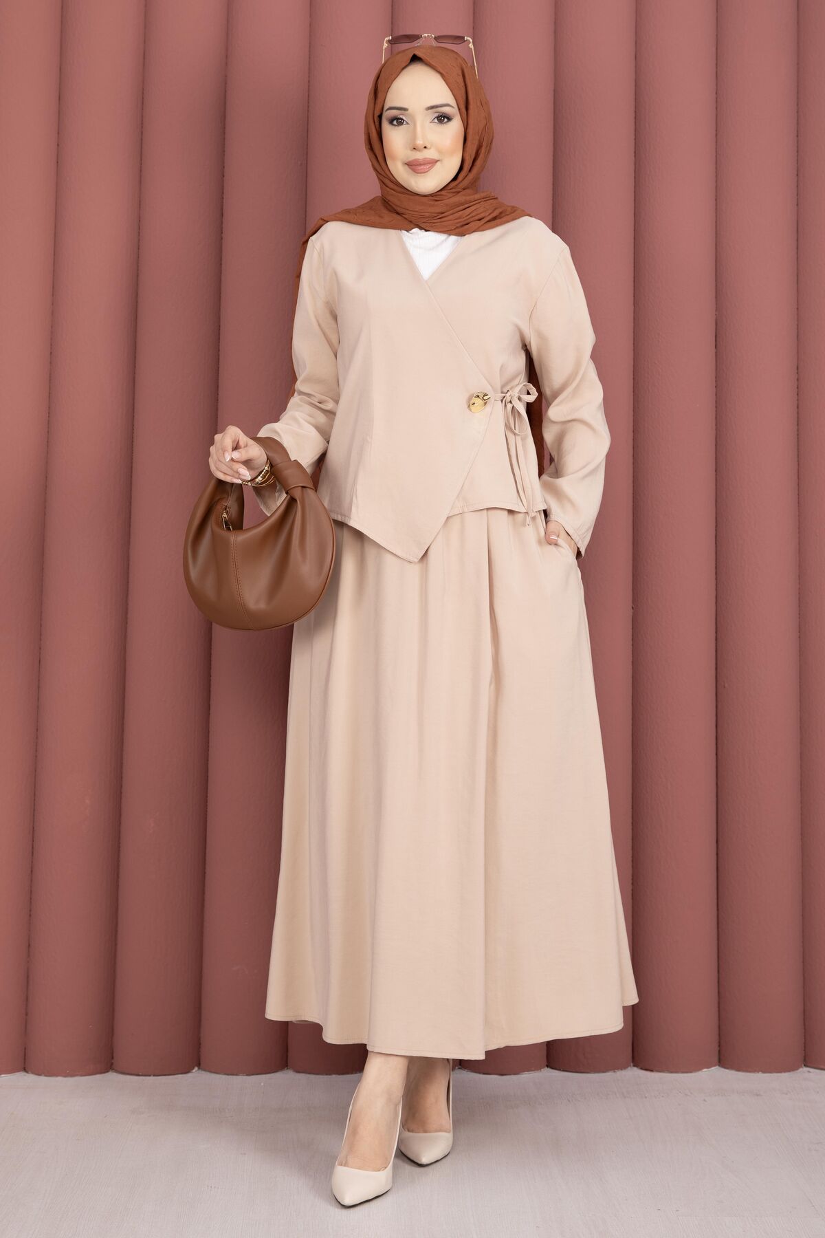 Yandan Bağlamalı Kimono Etek İkili Takım Bej