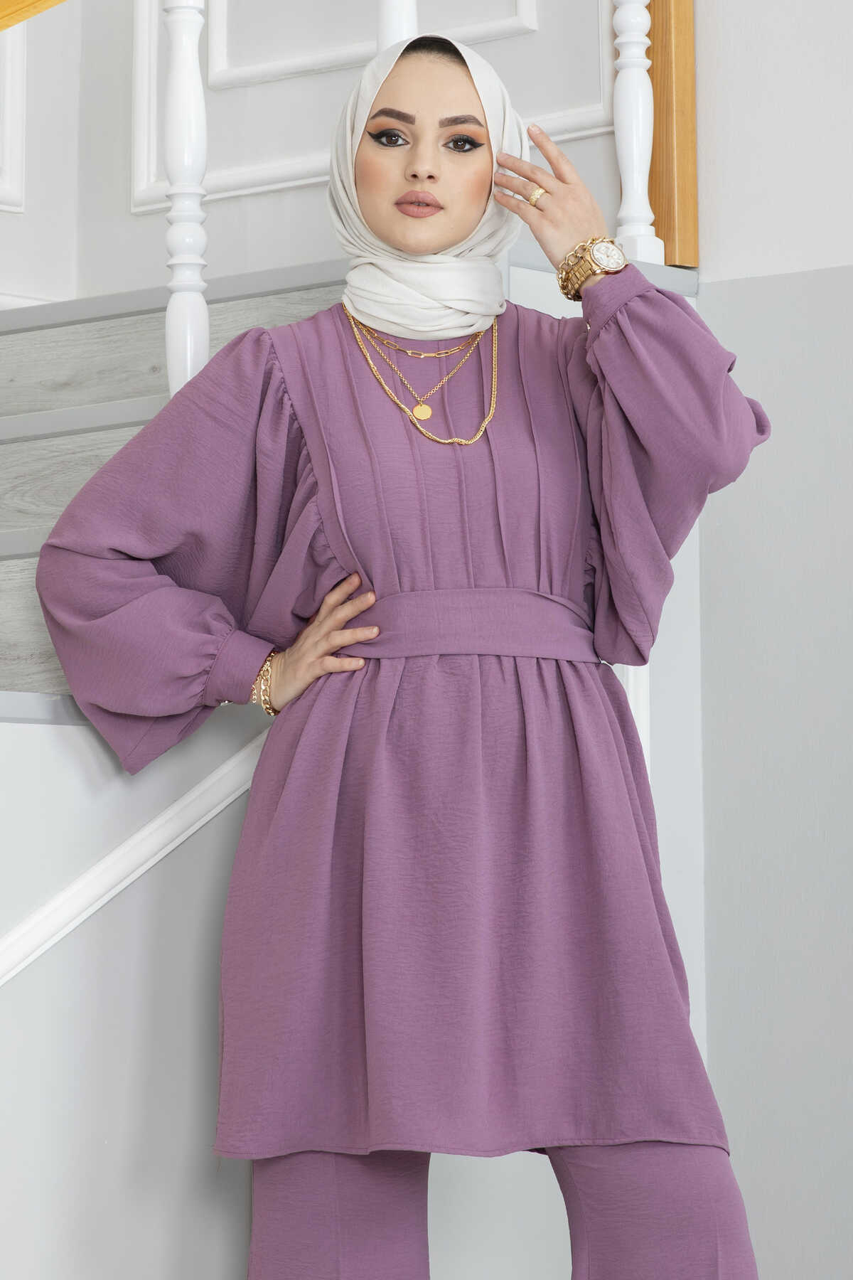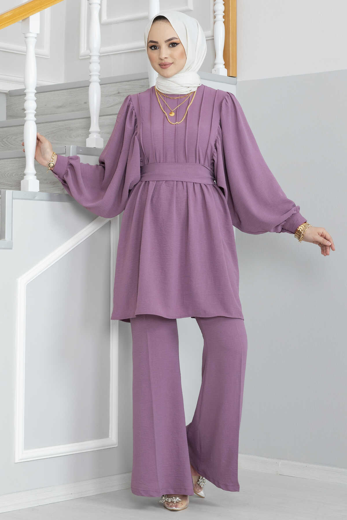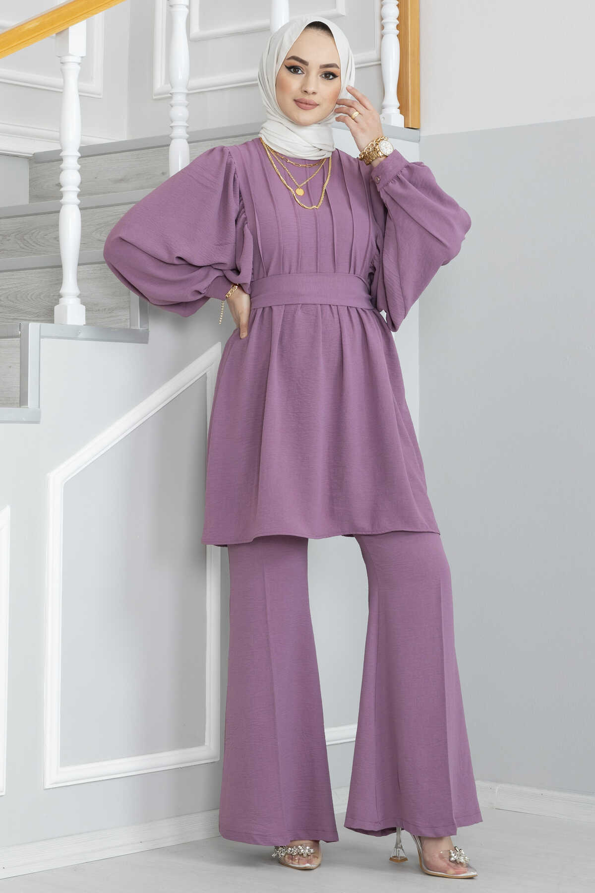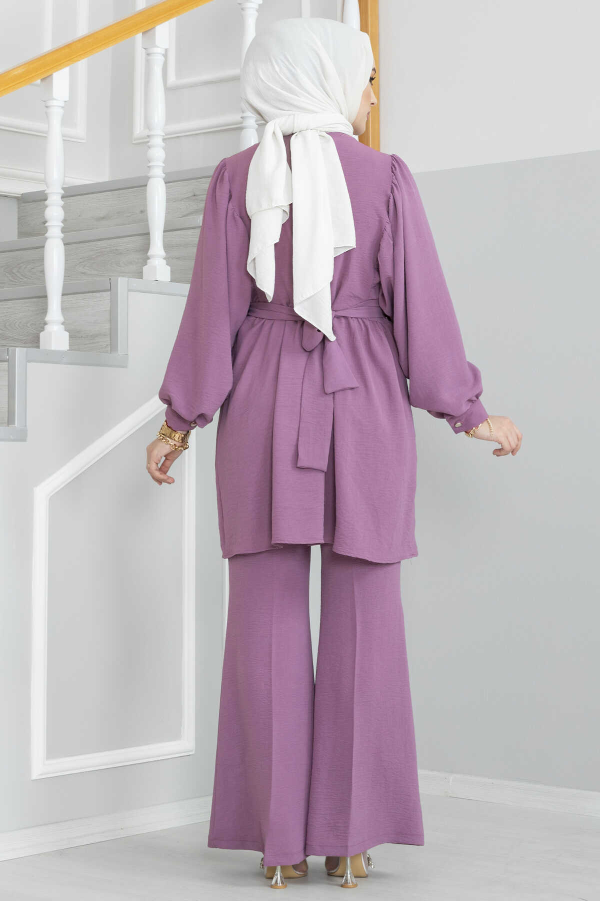 - Ürün mevsimliktir. Ürün tunik ve pantolon olmak üzere iki parçadan oluşmaktadır. Tunik yarasa kollu olup kol manşetleri düğmelidir. Ayrıca önünde drape detayları mevcuttur. Kuşaklı vardır fakat isteğe göre kullanılmaya bilir. Pantolon İspanyol paçadır ve rahat salaş modeldir. Tunik kolay kullanım açısından arkası fermuarlıdır.