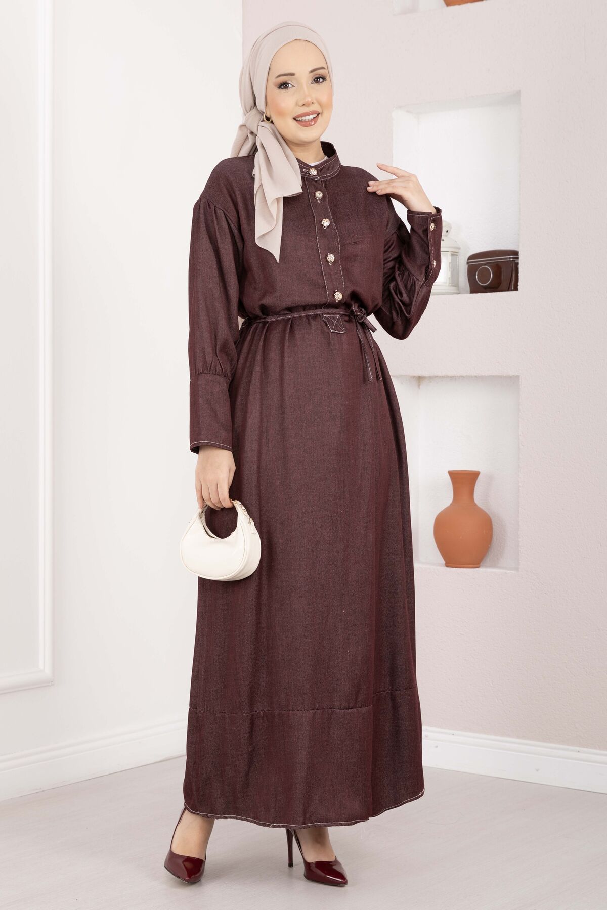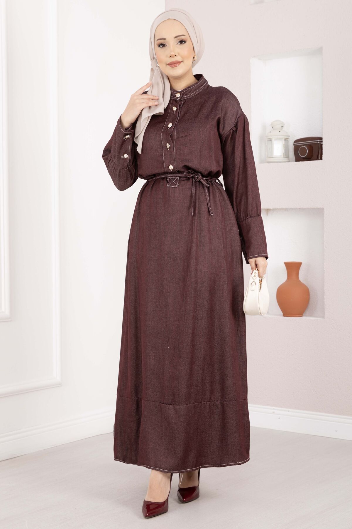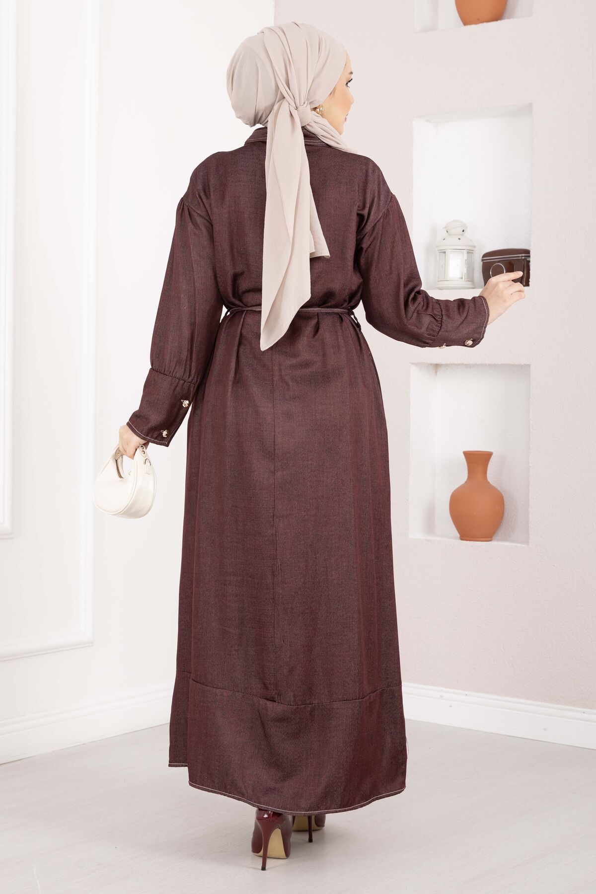 Yarım Düğmeli Kuşaklı Tensel Kot Elbise