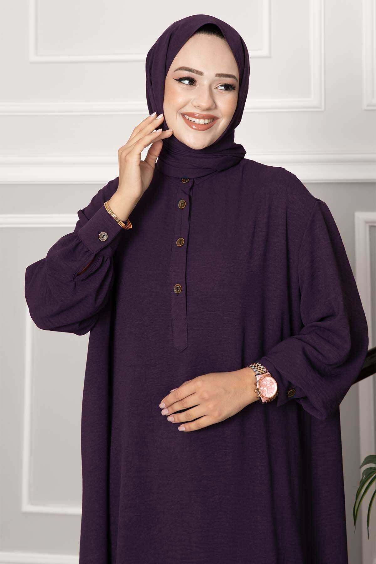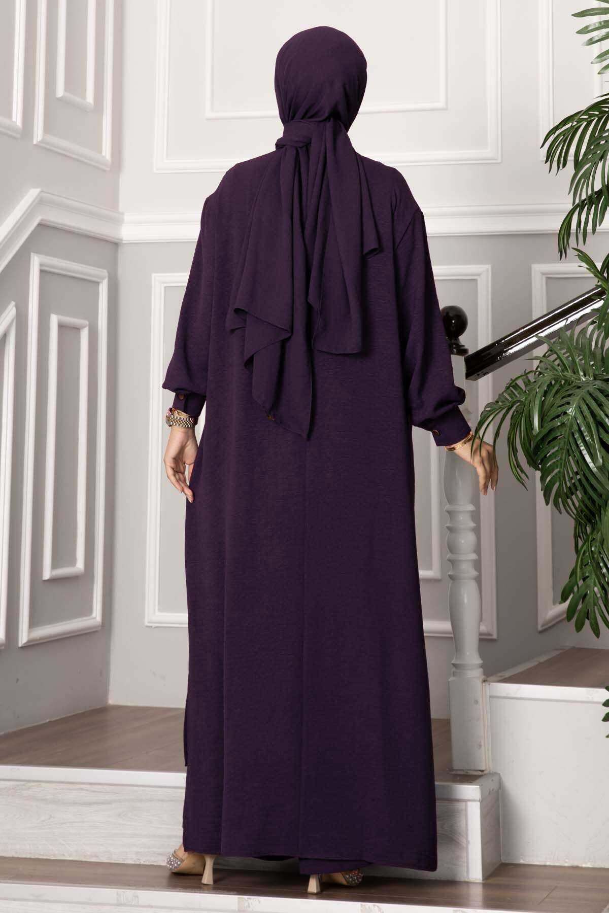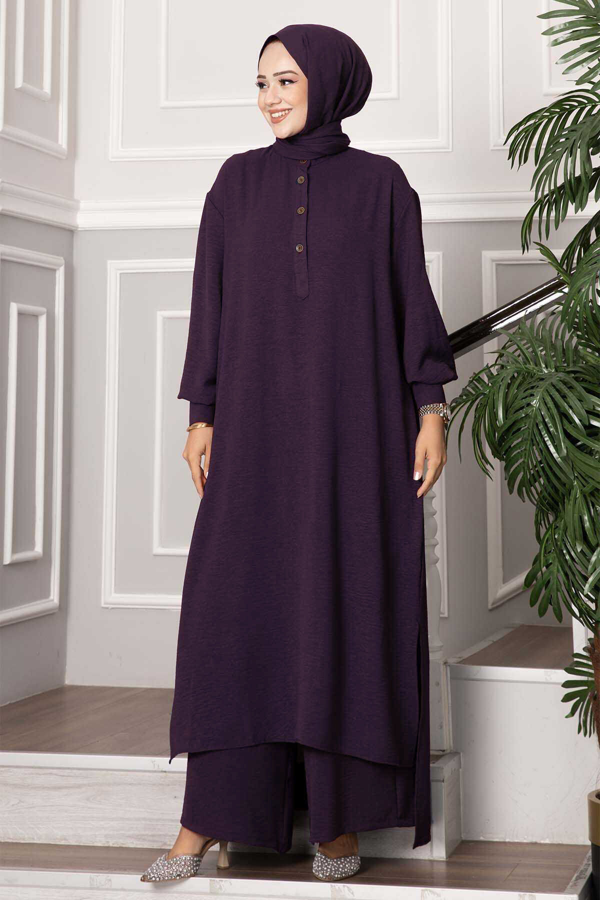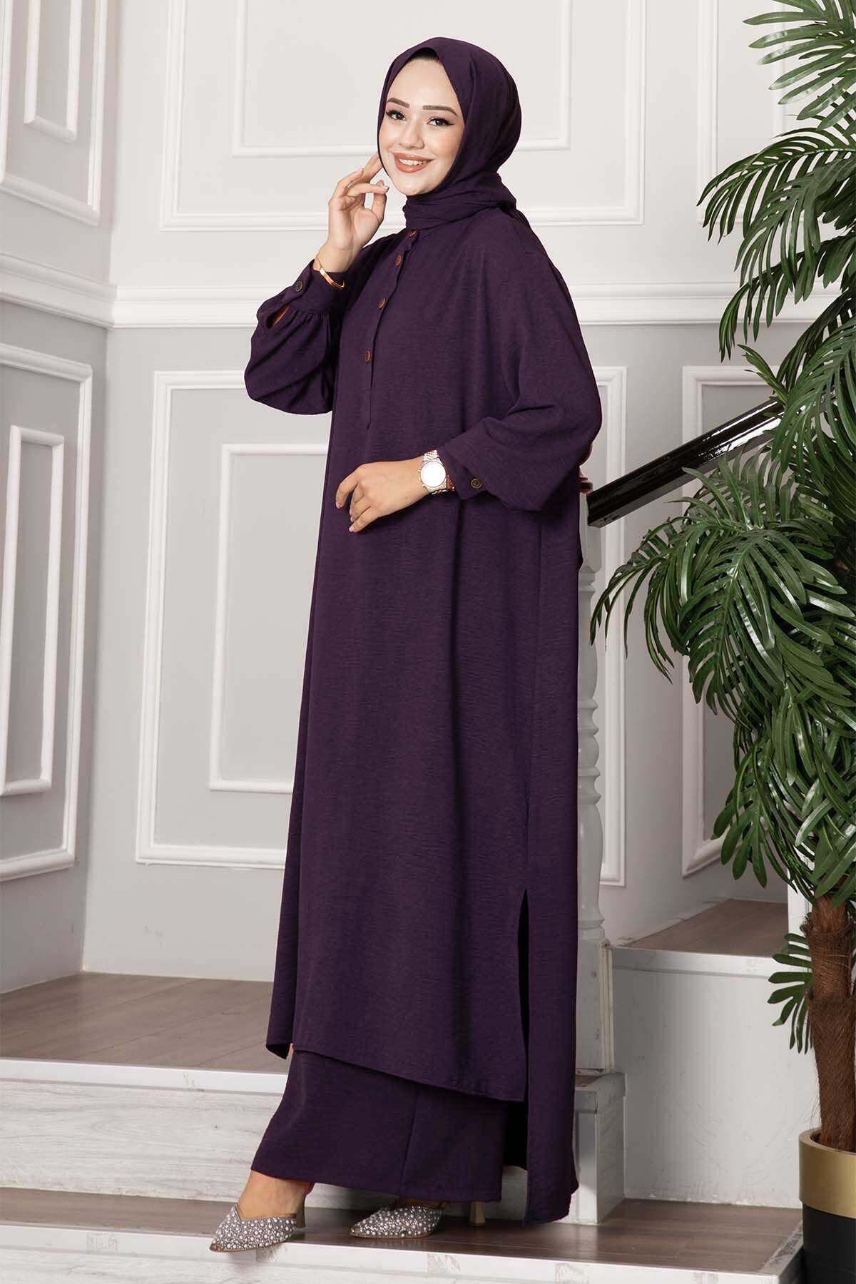 Yarım Düğmeli Uzun Tesettür İkili Takım Mürdüm