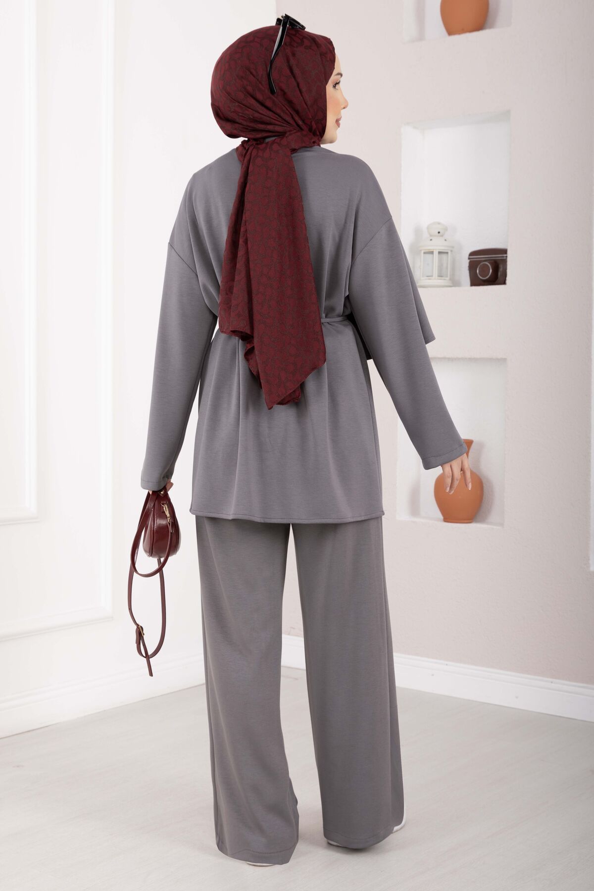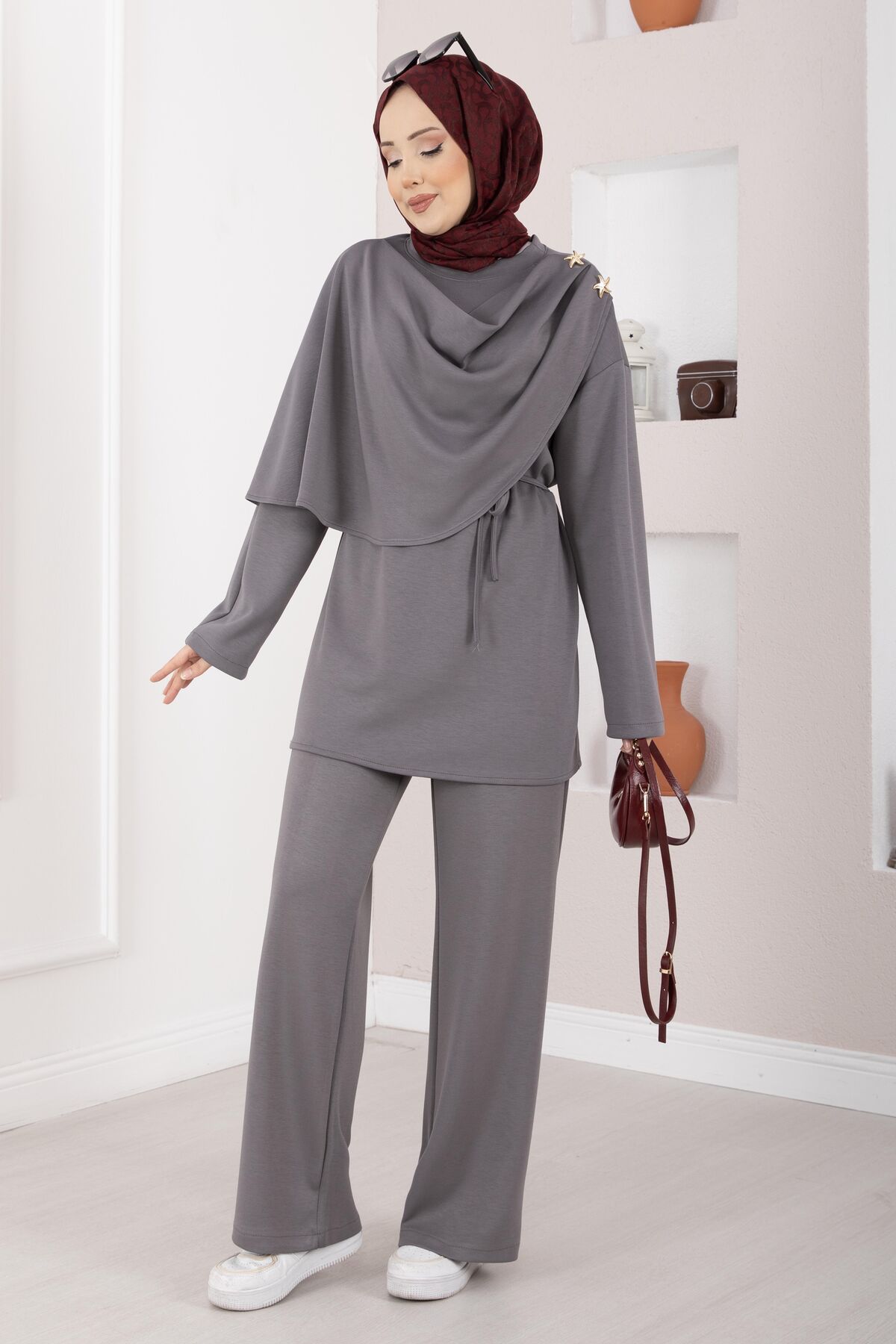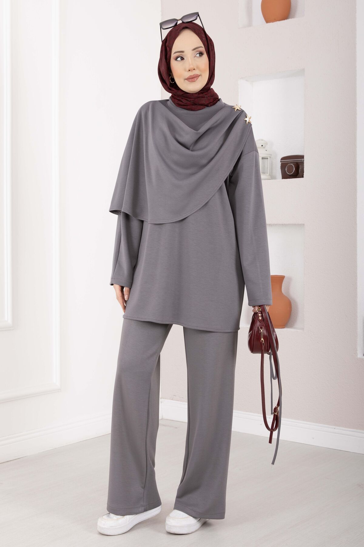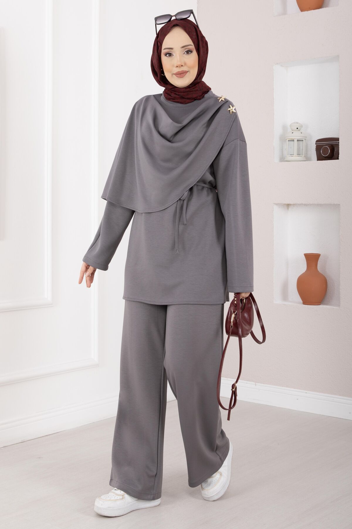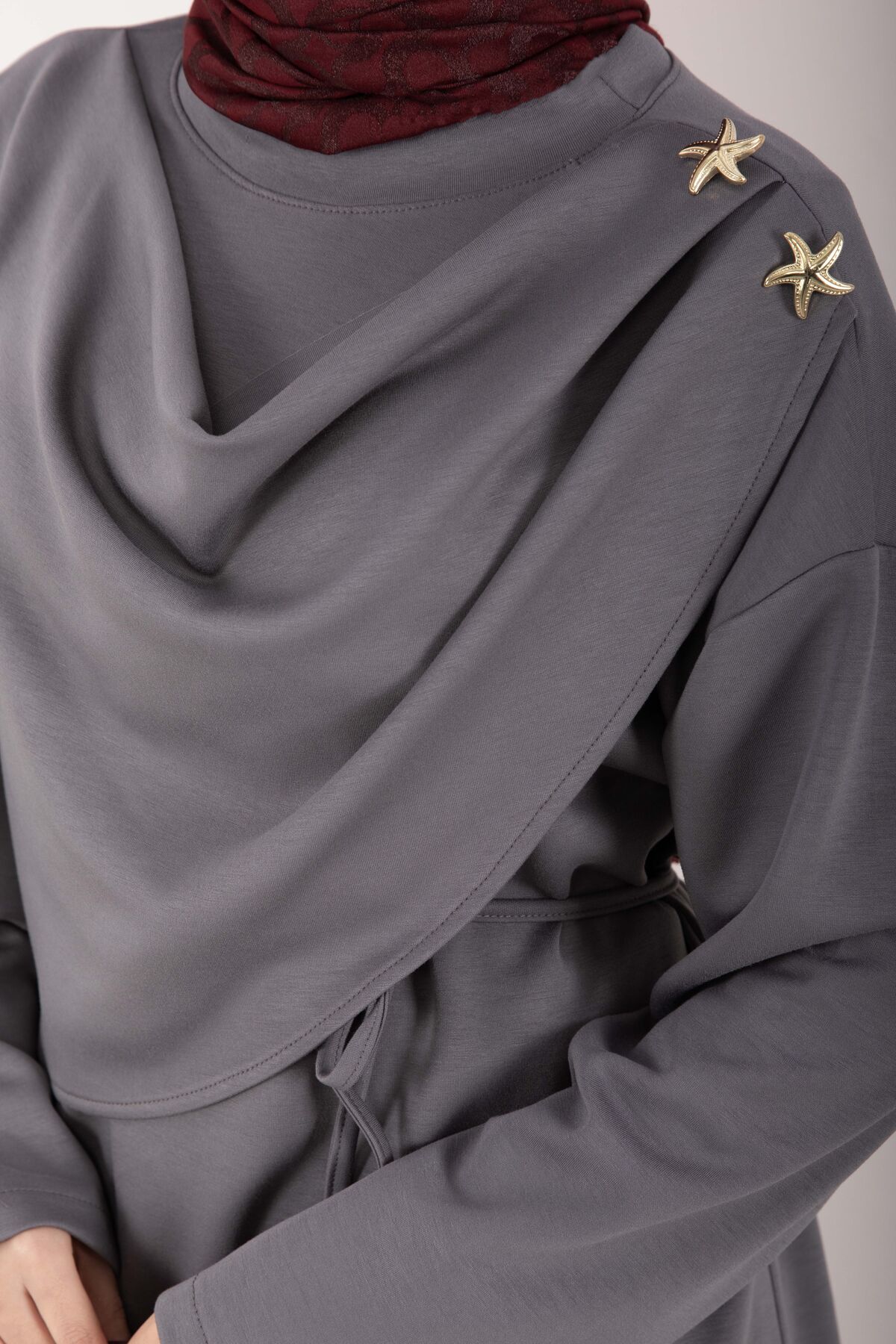 Yıldız Aksesuarlı Drapeli Tesettür İkili Takım Gri