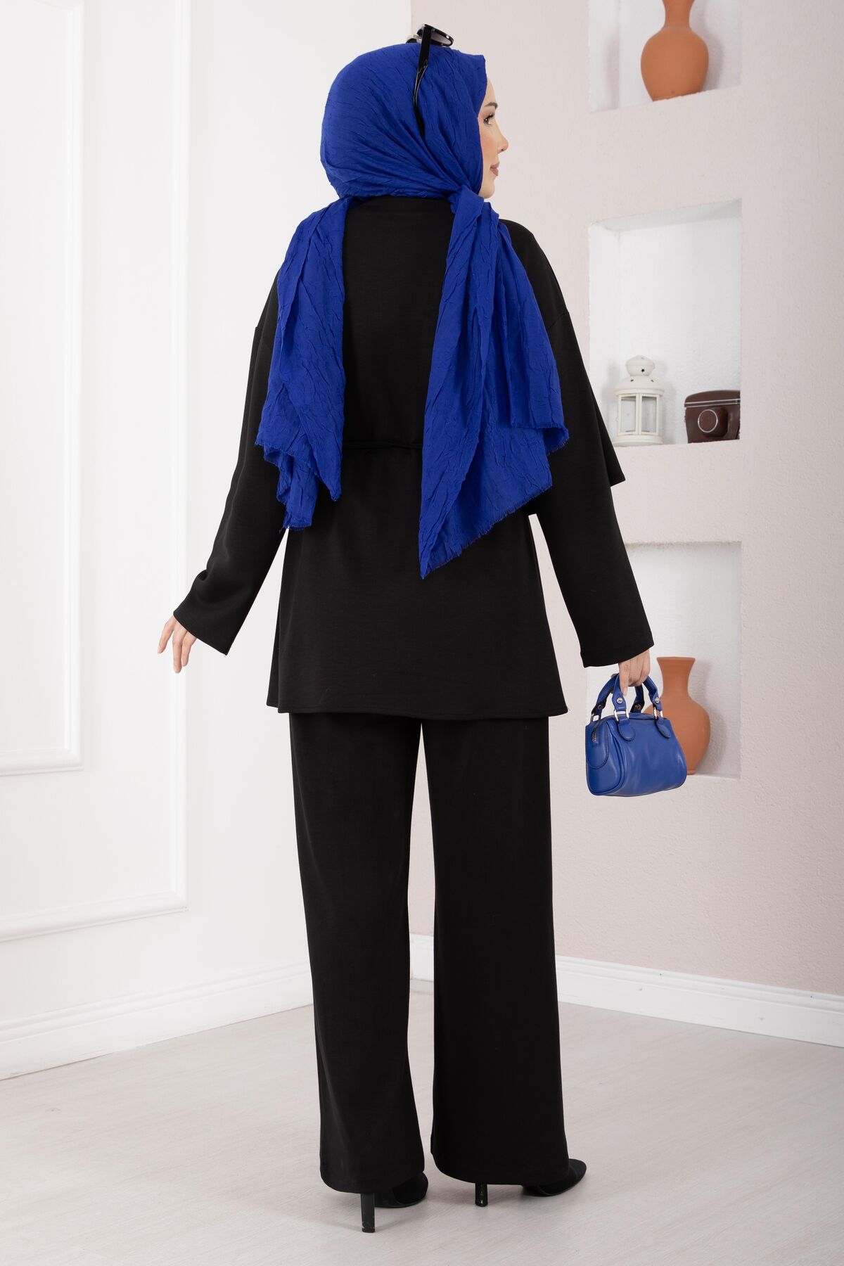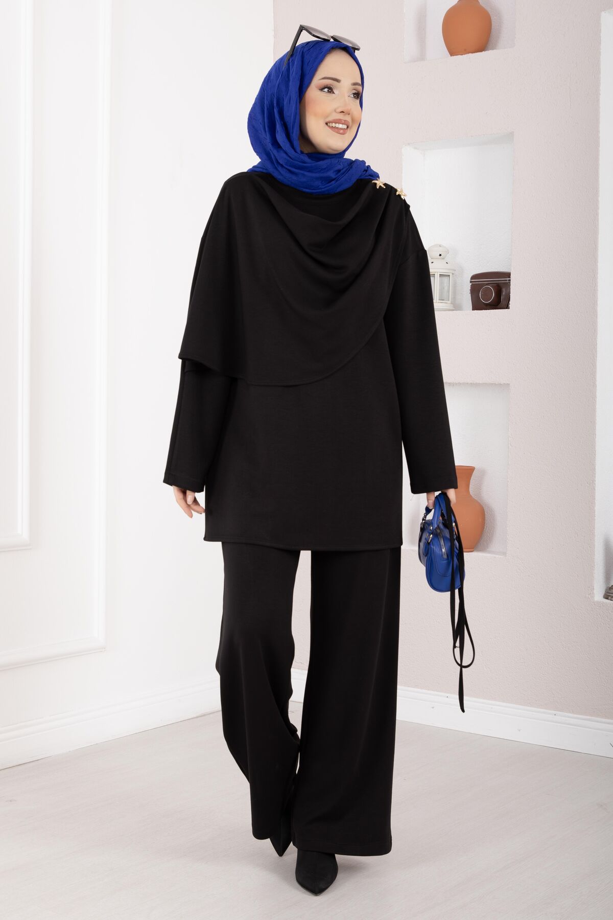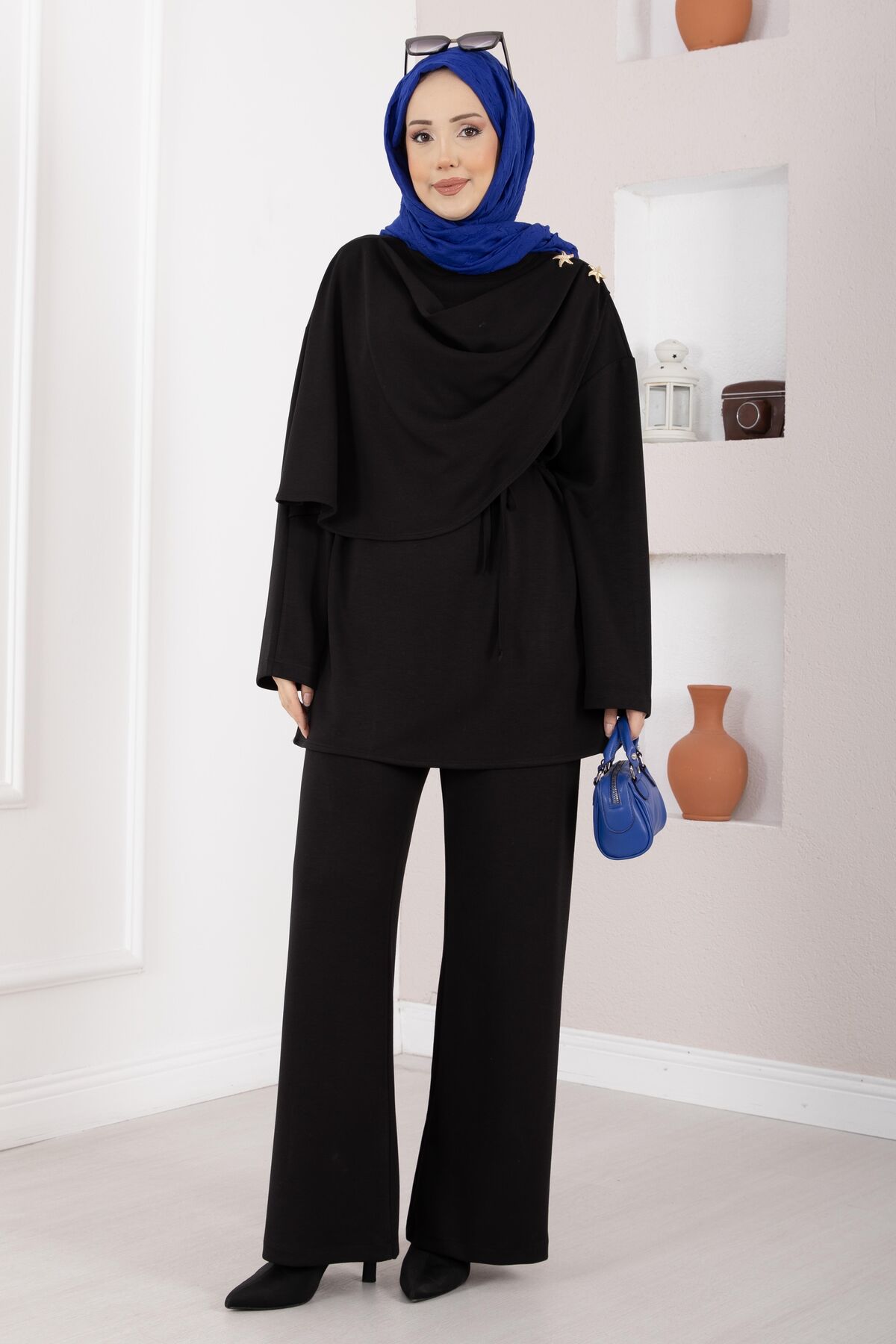 Yıldız Aksesuarlı Drapeli Tesettür İkili Takım Siyah