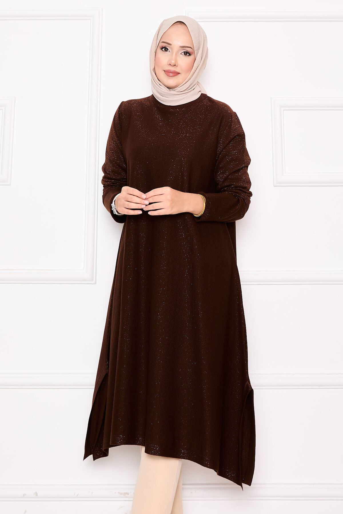 Yırtmaç Detaylı Simli Mevlana Triko Tunik Kahve