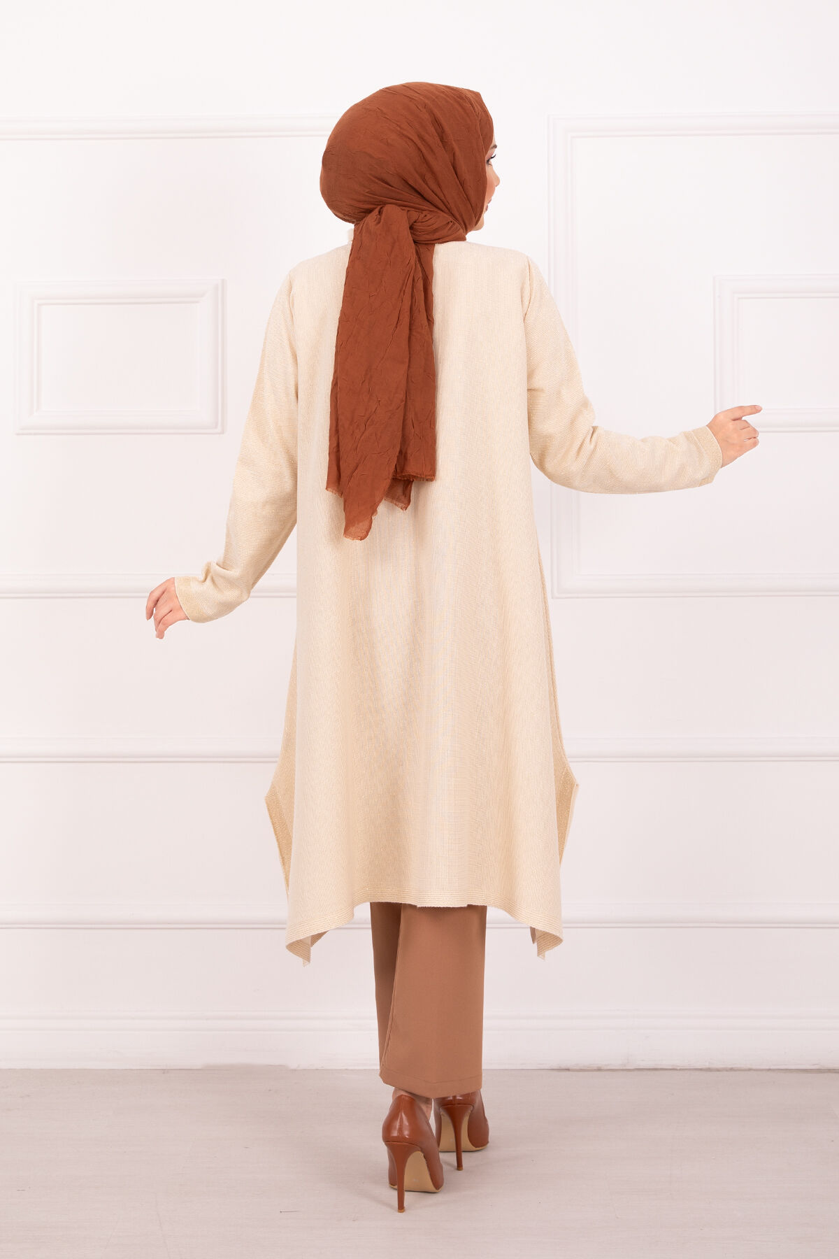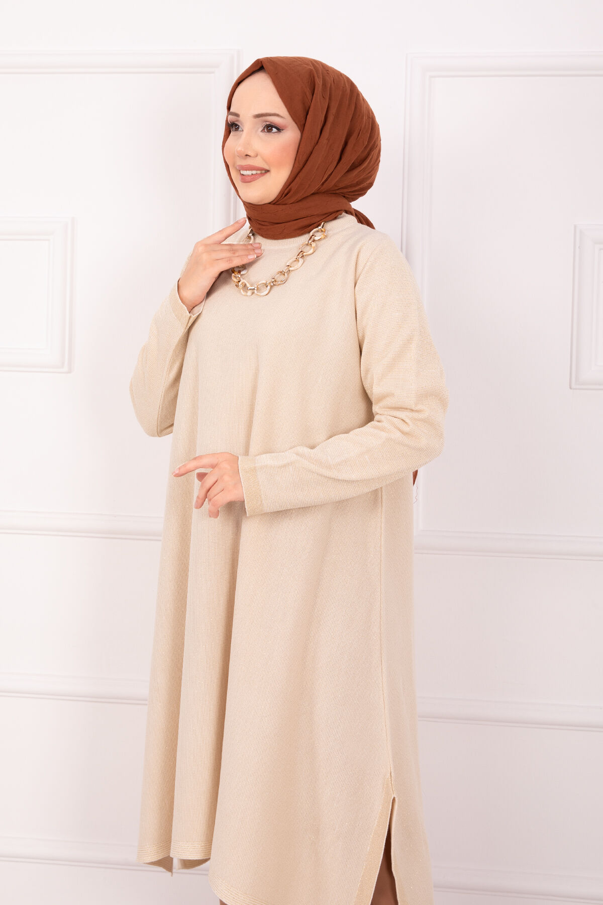 Yırtmaç Detaylı Simli Mevlana Triko Tunik Krem