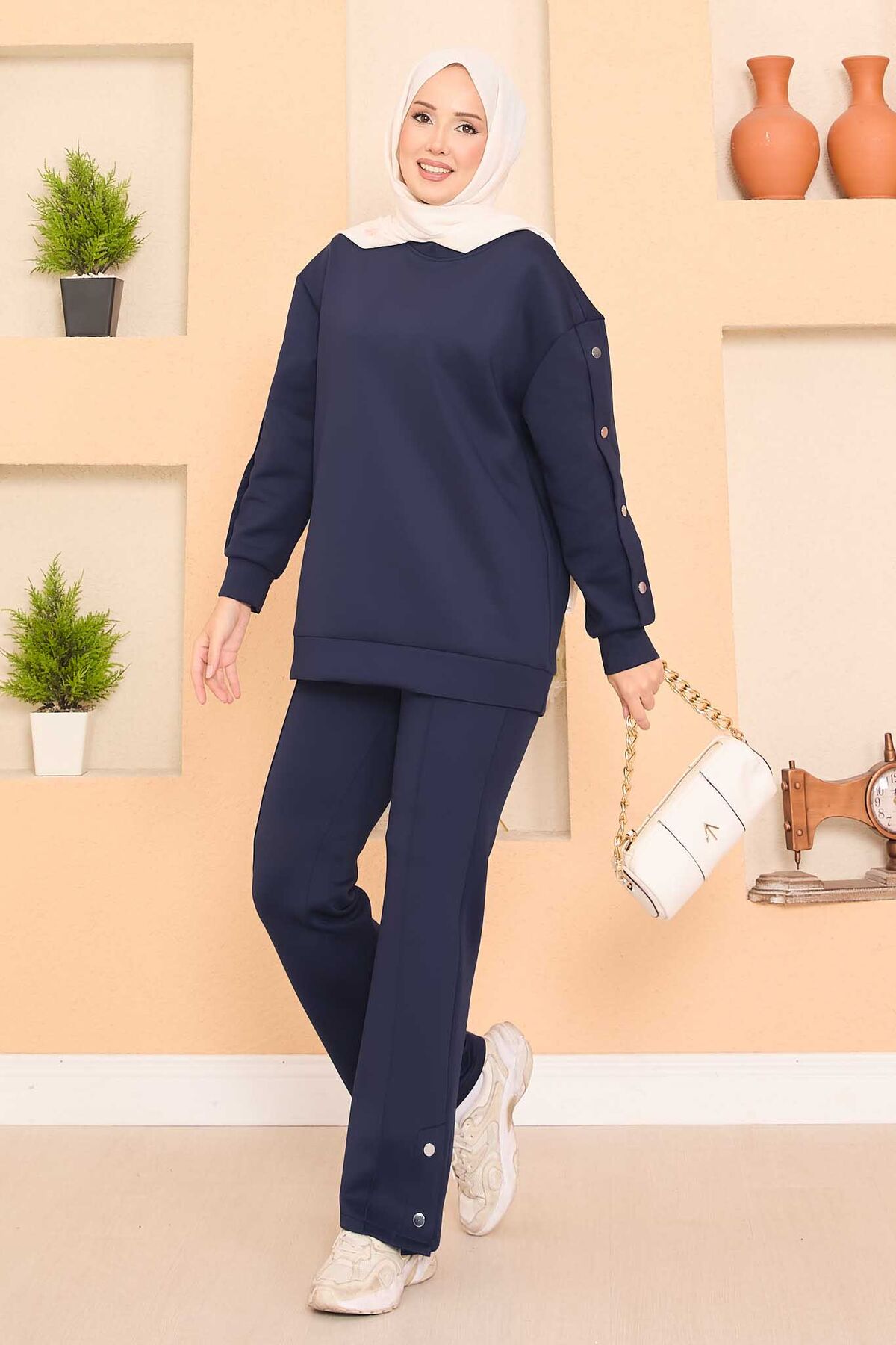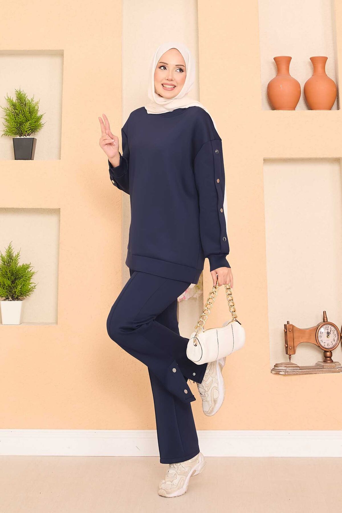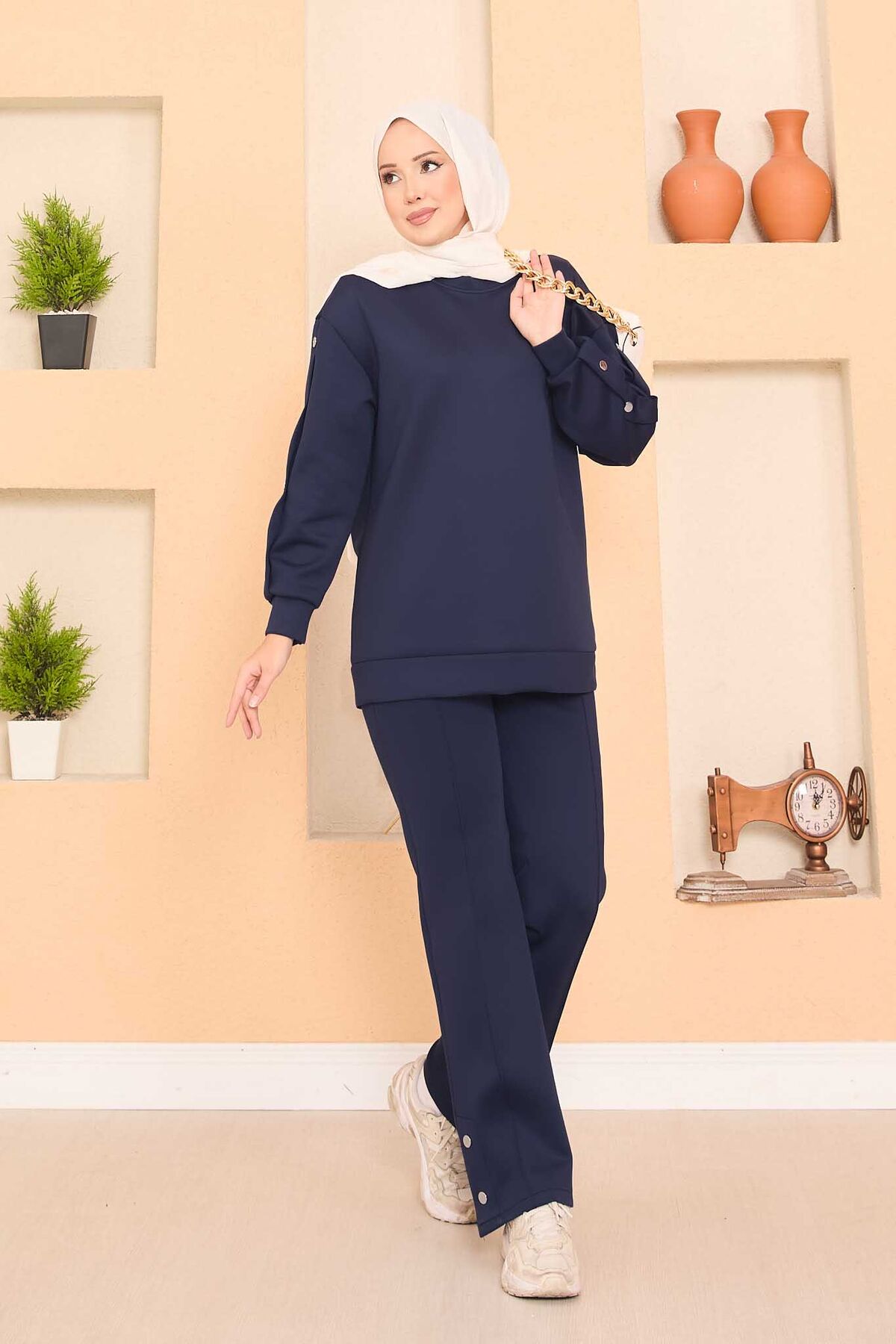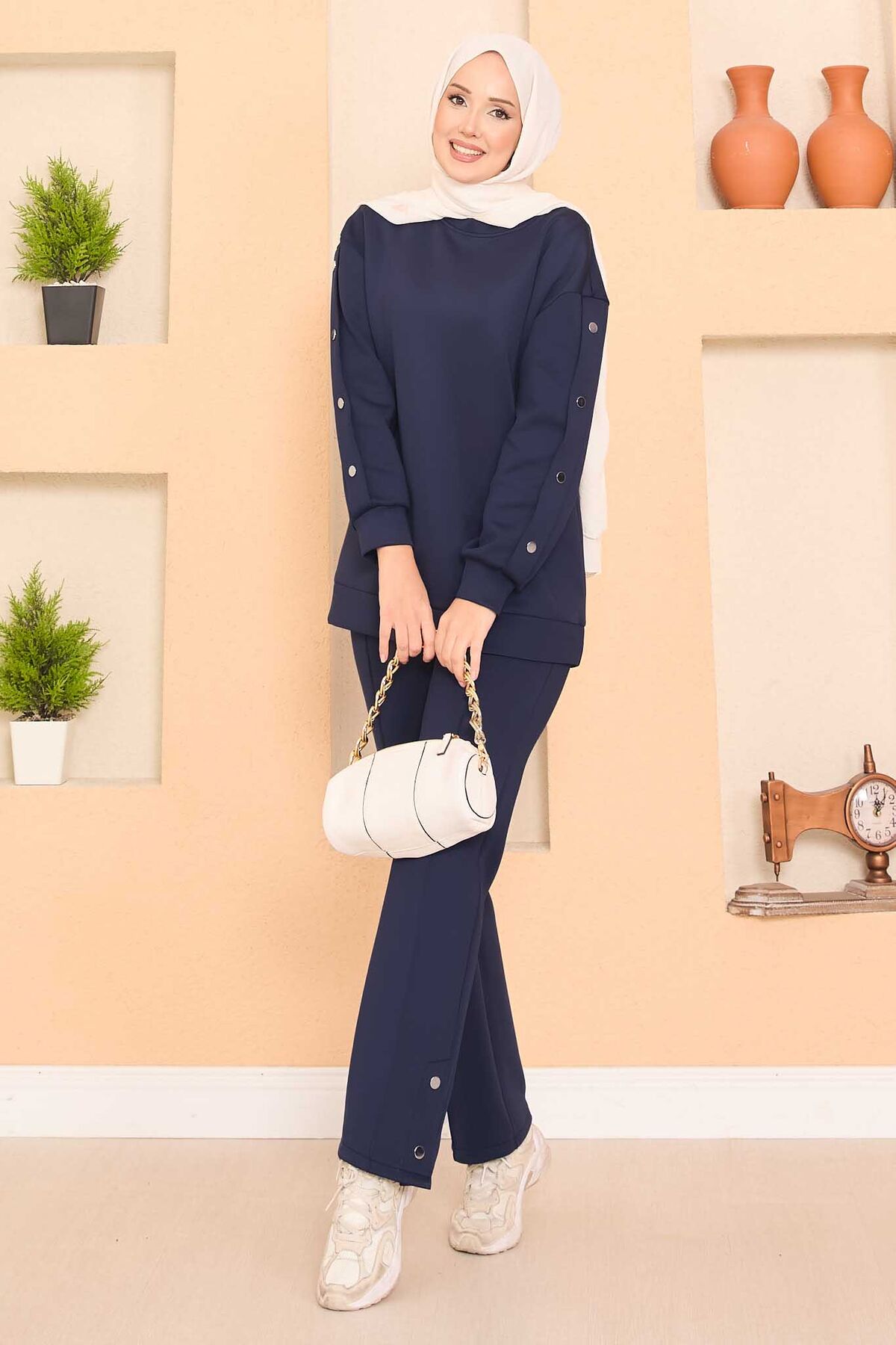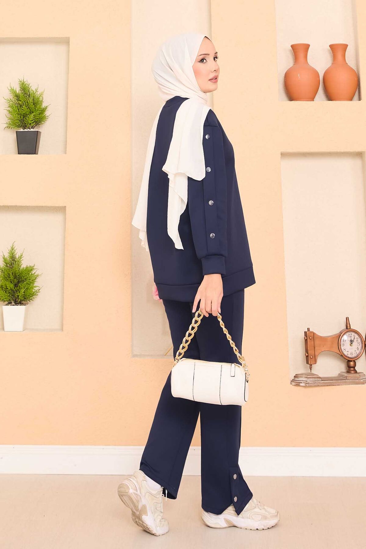 Yırtmaçlı Çıtçıt Detaylı Tesettür İkli Takım Lacivert