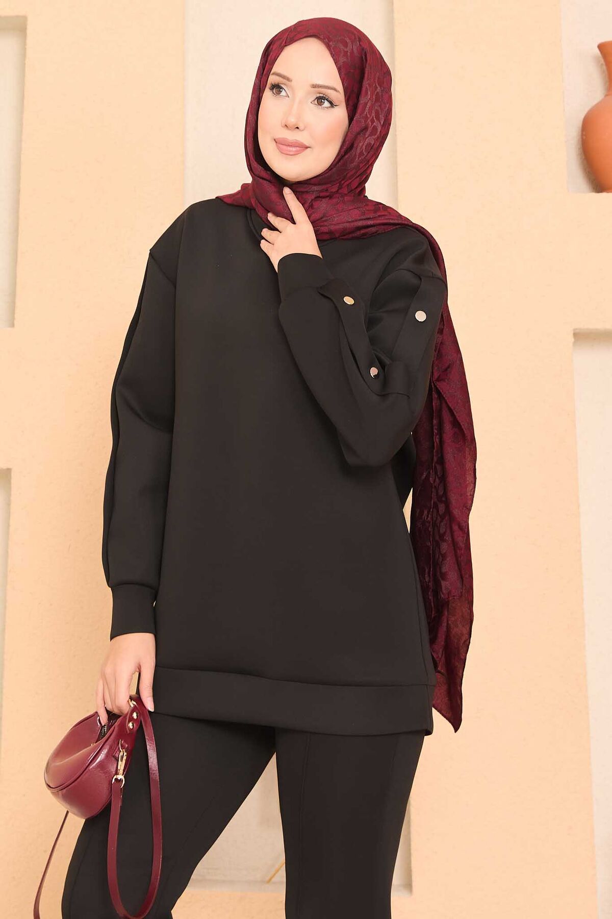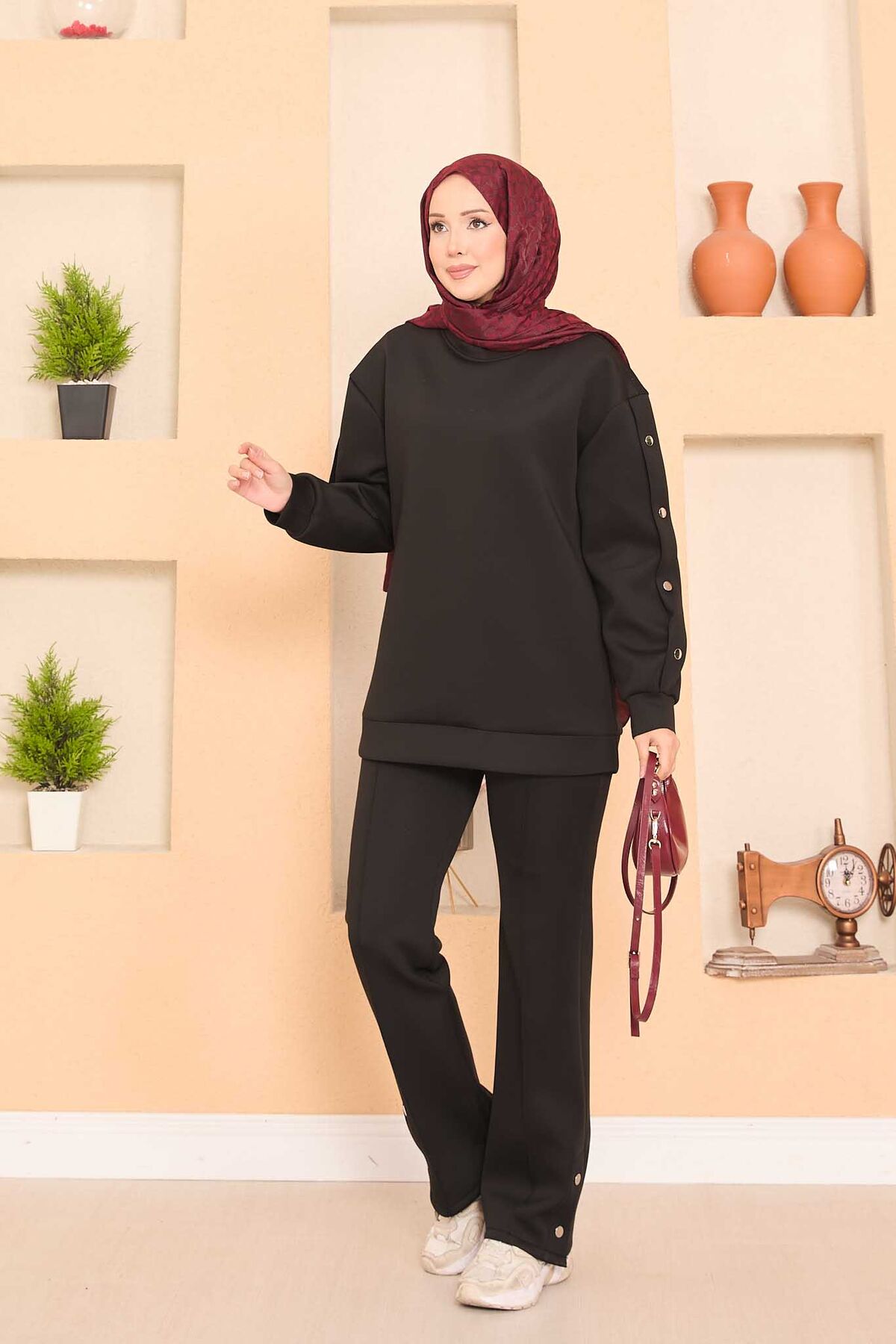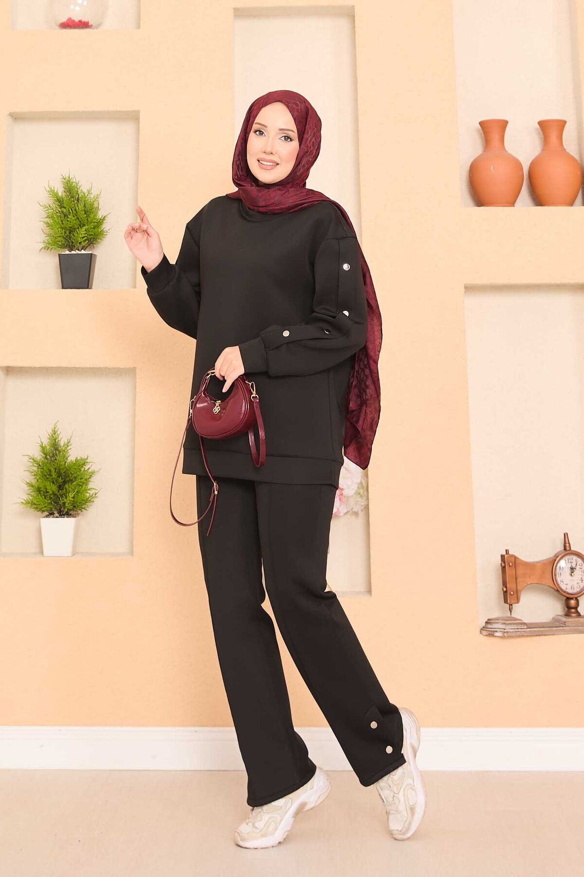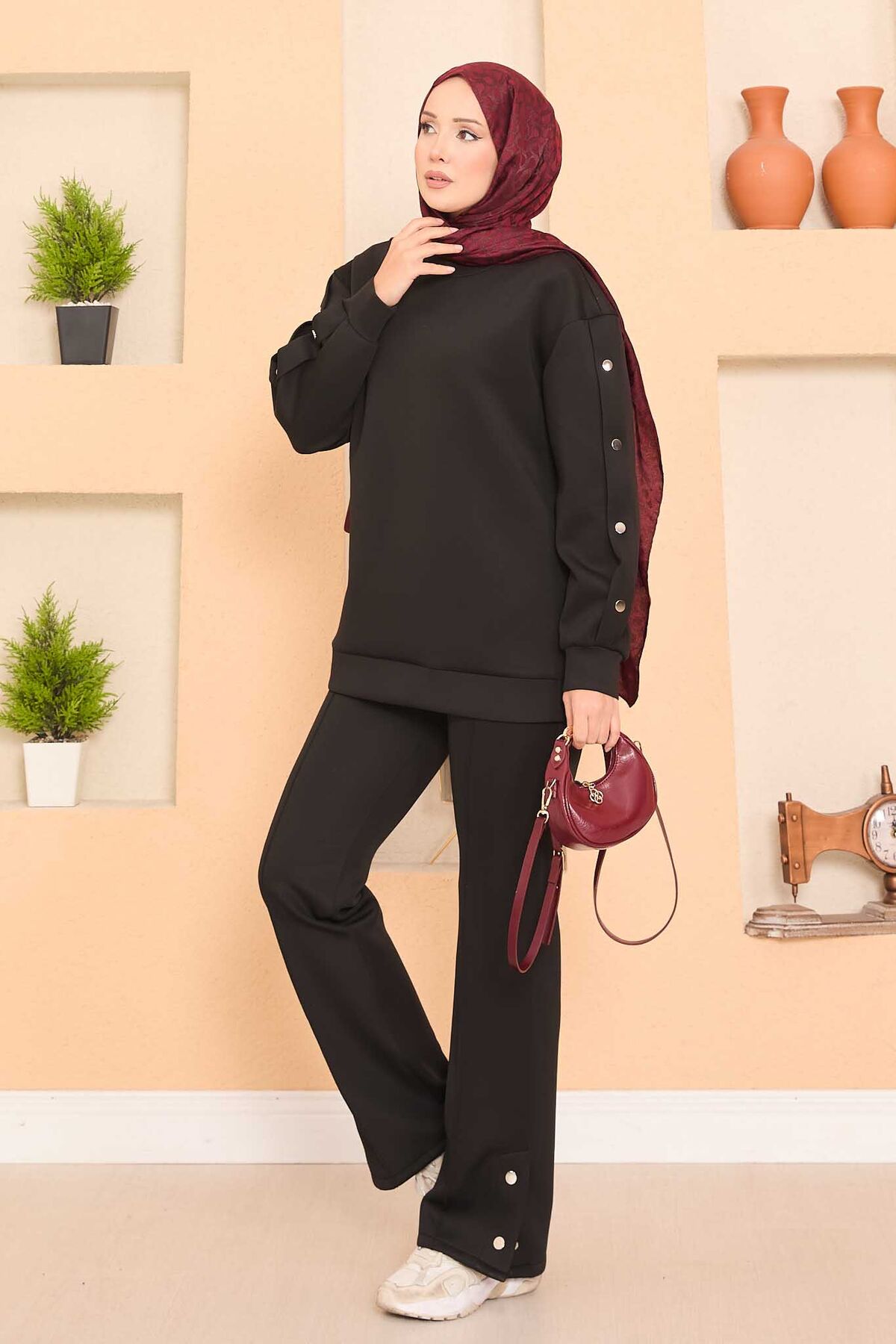 Yırtmaçlı Çıtçıt Detaylı Tesettür İkli Takım Siyah