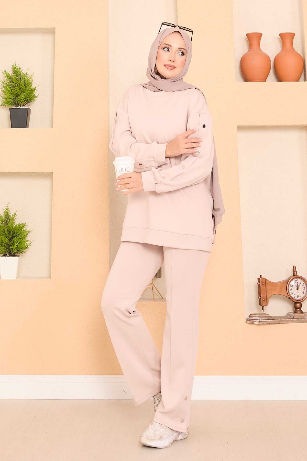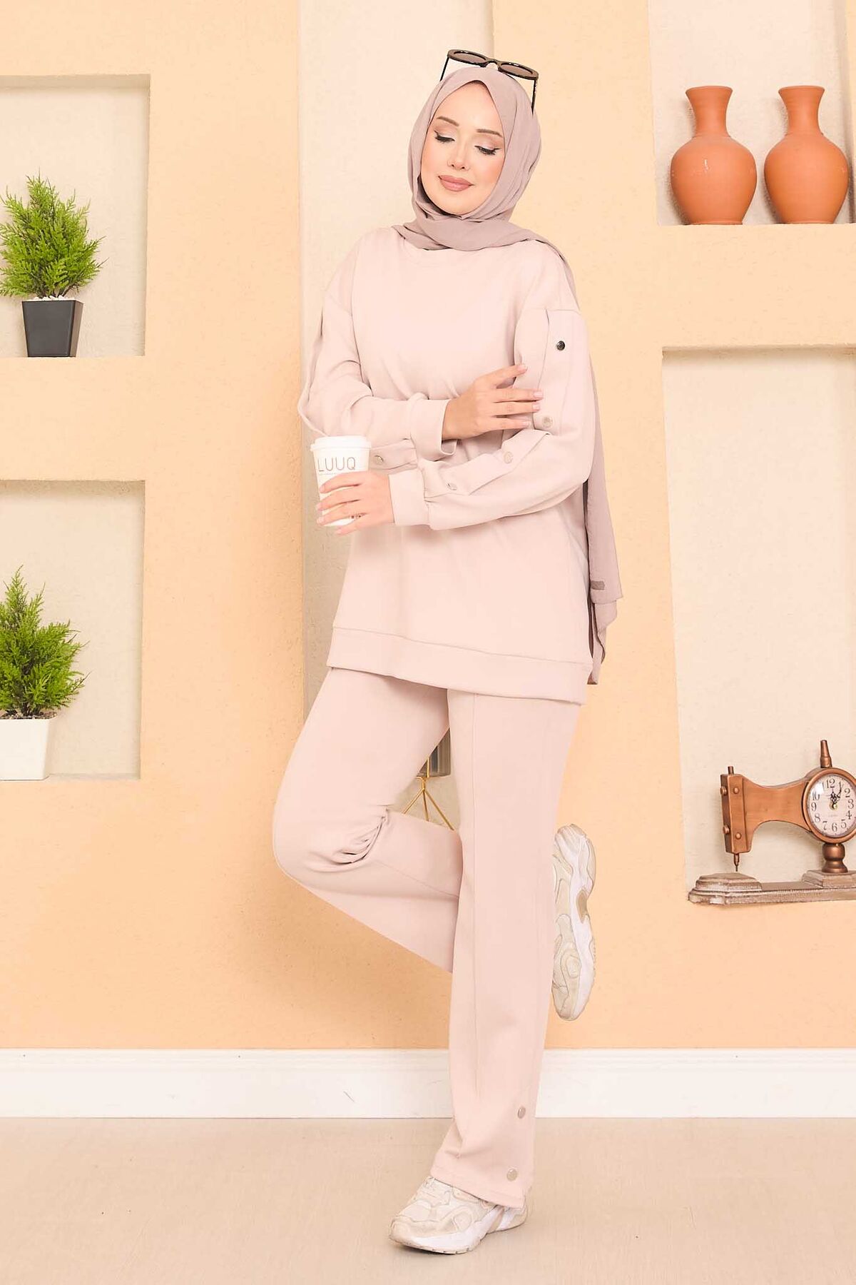 - Ürün mevsimliktir. Yırtmaçlı kol ve pantalon paçası çıtçıt detaylı ikili tesettür takım. Pantalonun beli lastiklidir.bisiklet yakadır.