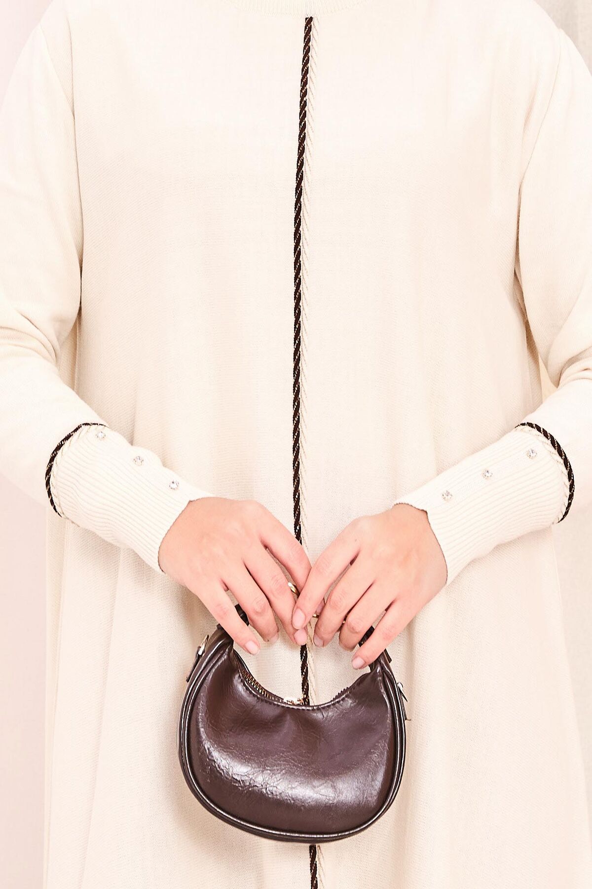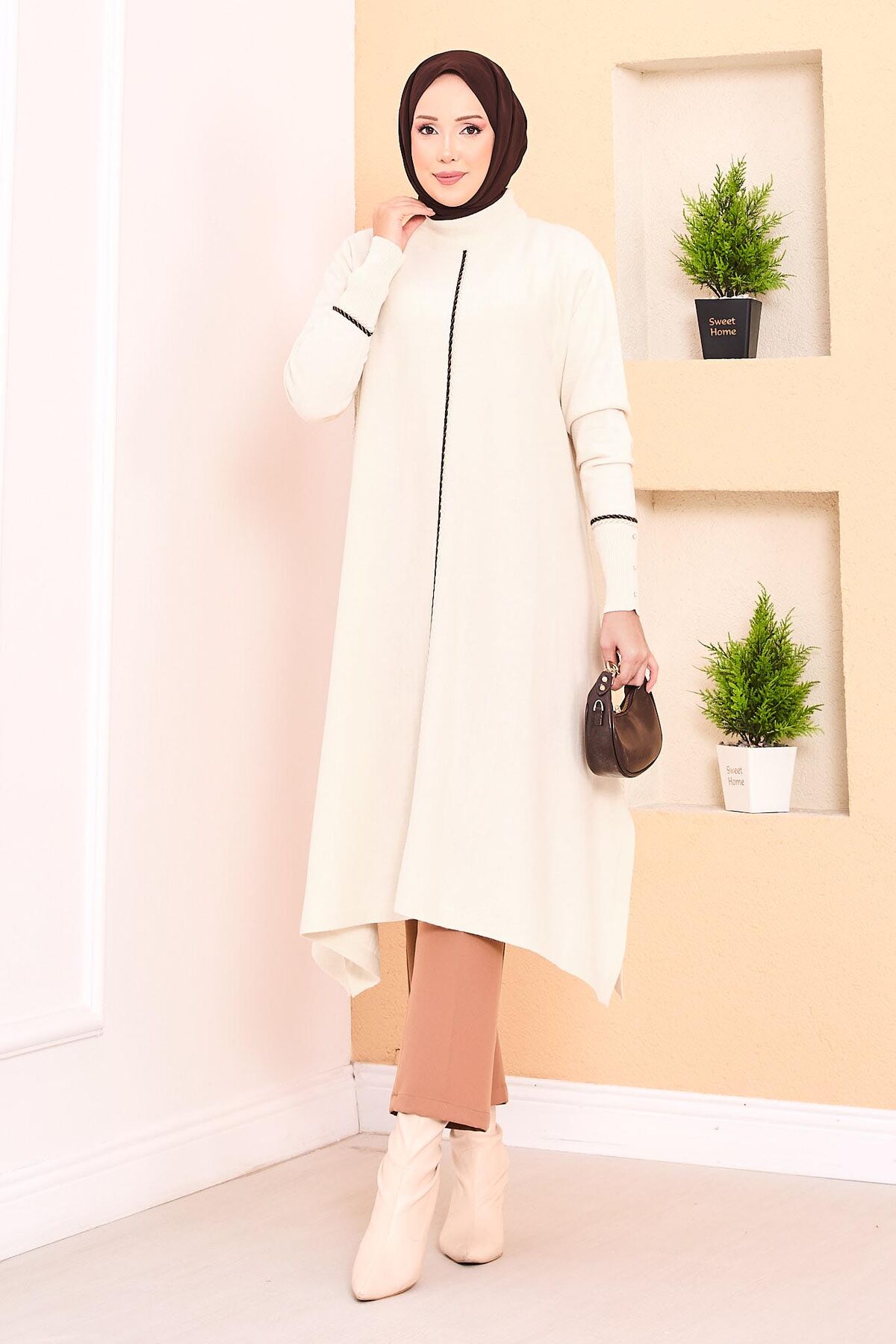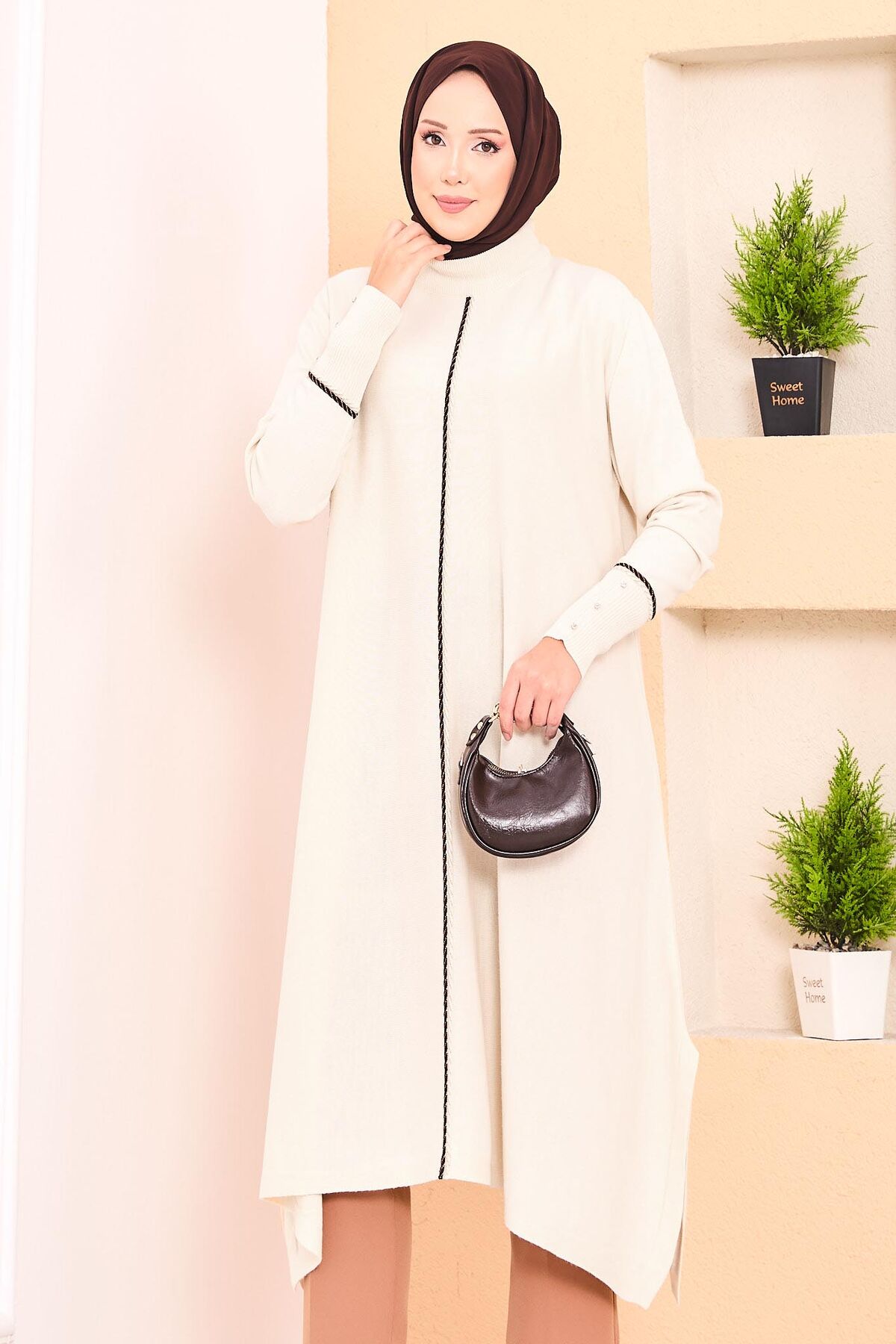 Zarif Sim Şeritli Mevlana Triko Tunik Ekru