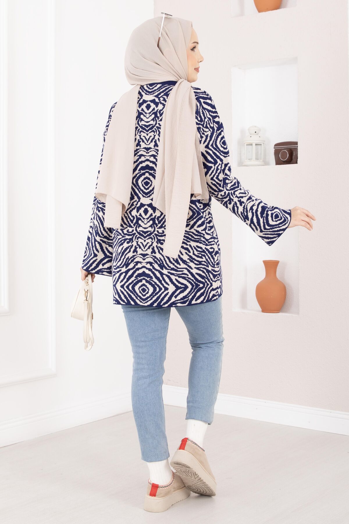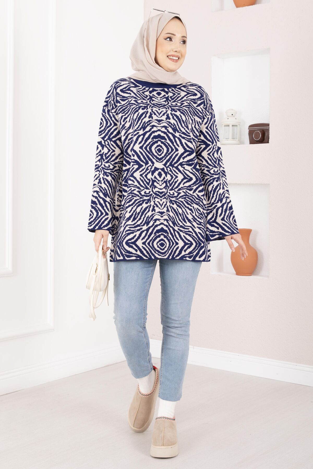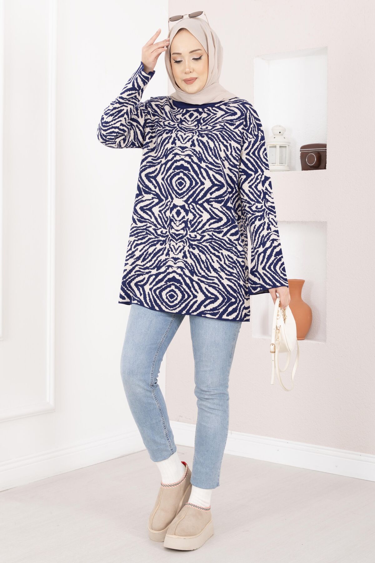 Zebra Desen Triko Kazak Lacivert