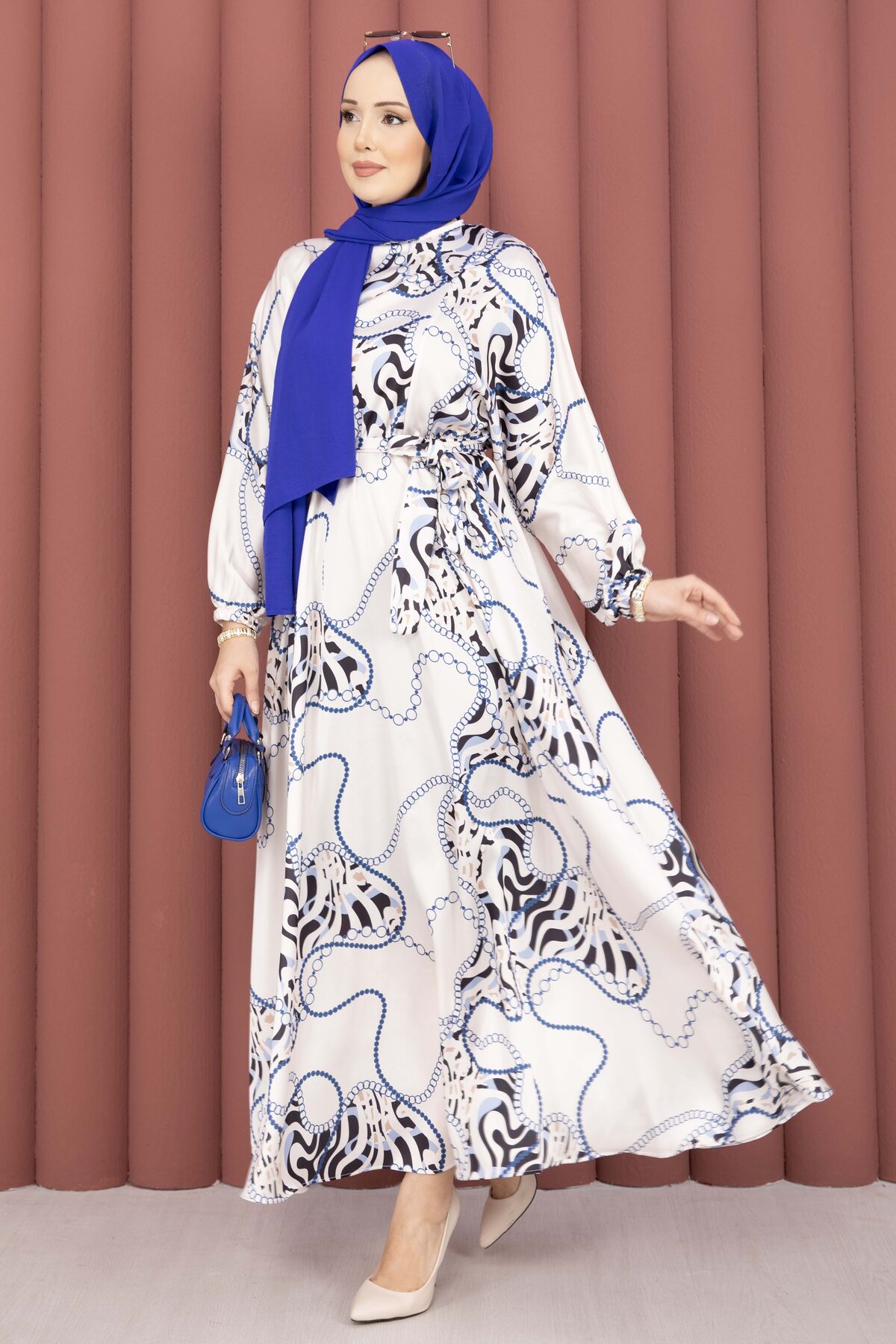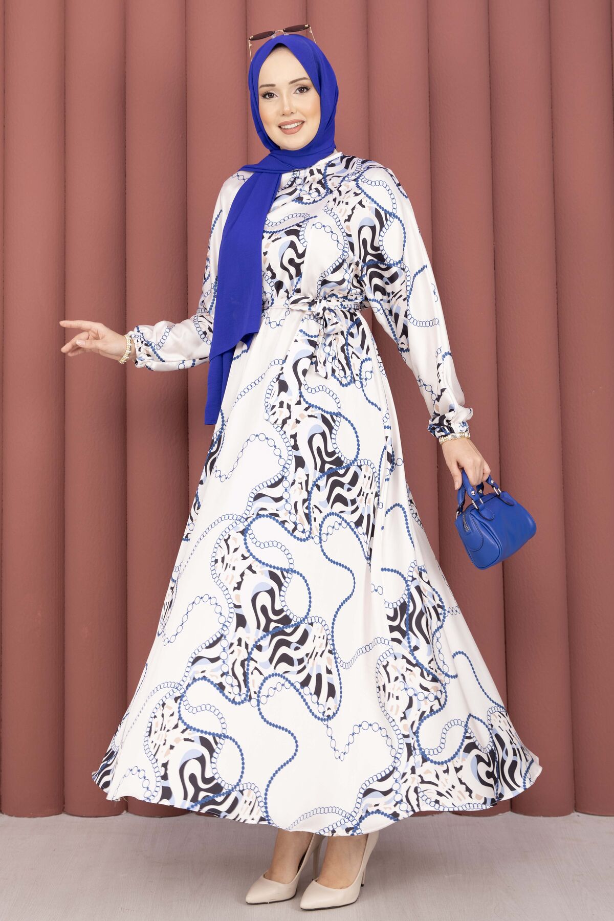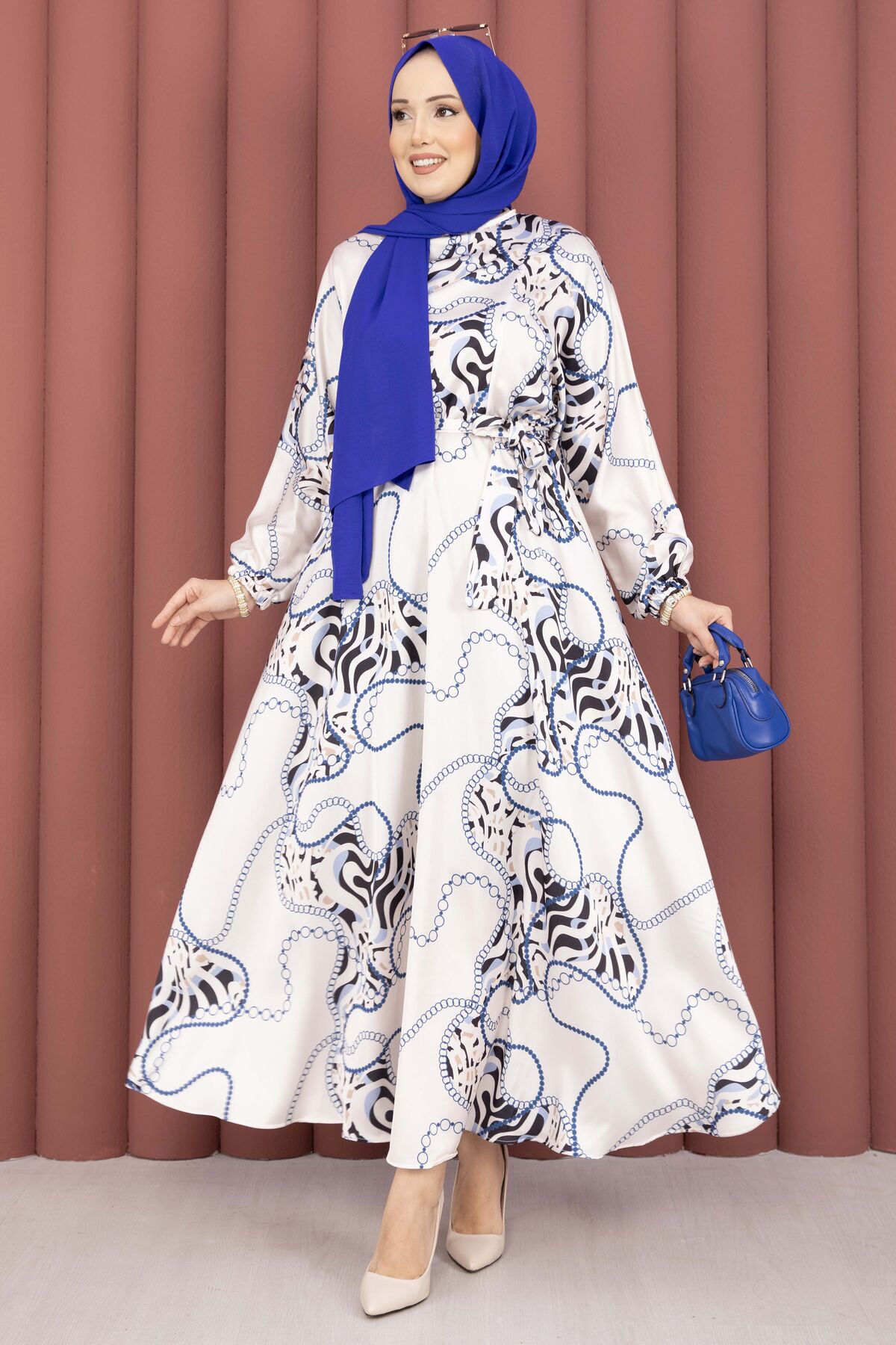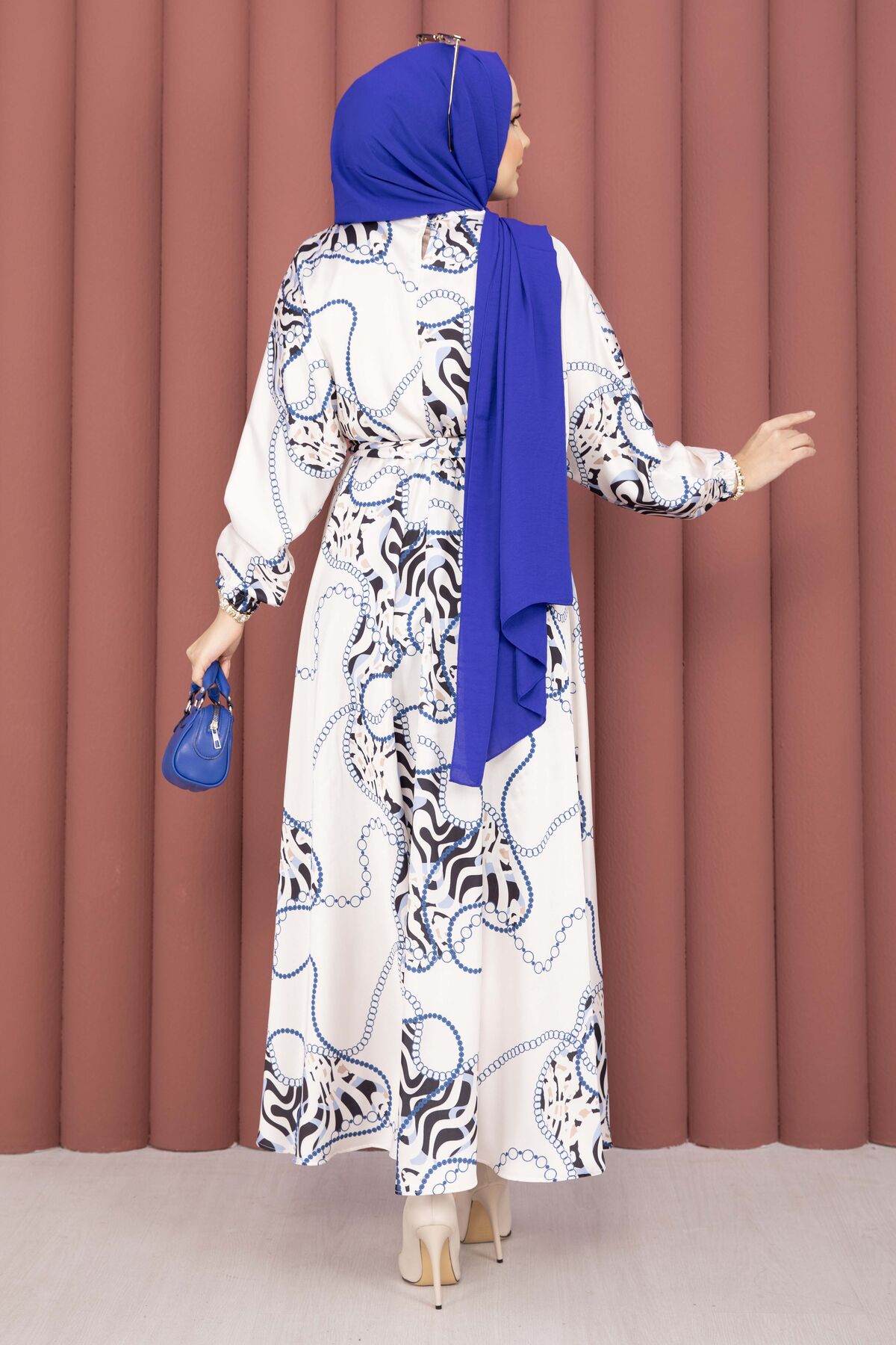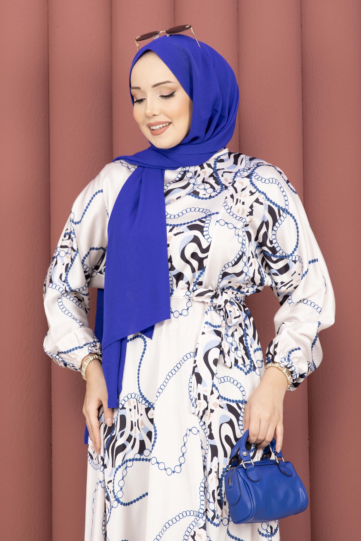 Zarif ve modern tasarımıyla öne çıkan Zincir Desen Kuşaklı Tesettür Elbise, dijital baskılı krep kumaşıyla şık bir görünüm sunar. Bel kısmındaki lastik ve seyyar kemeri sayesinde isteğe göre bel vurgusu yapılabilir, rahat ve konforlu bir kullanım sağlar. Günlük ve özel kombinlerde rahatlıkla tercih edilebilir.
