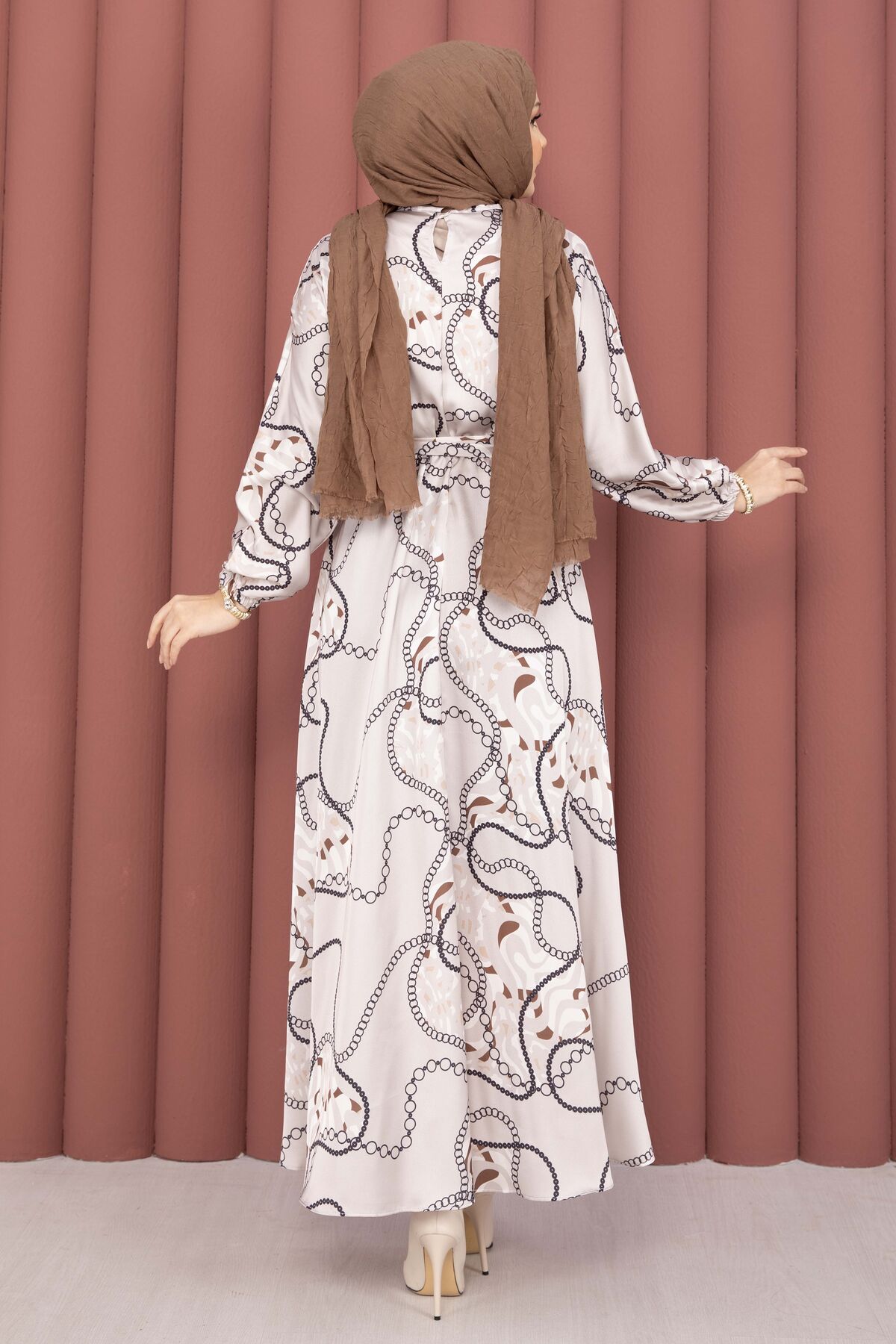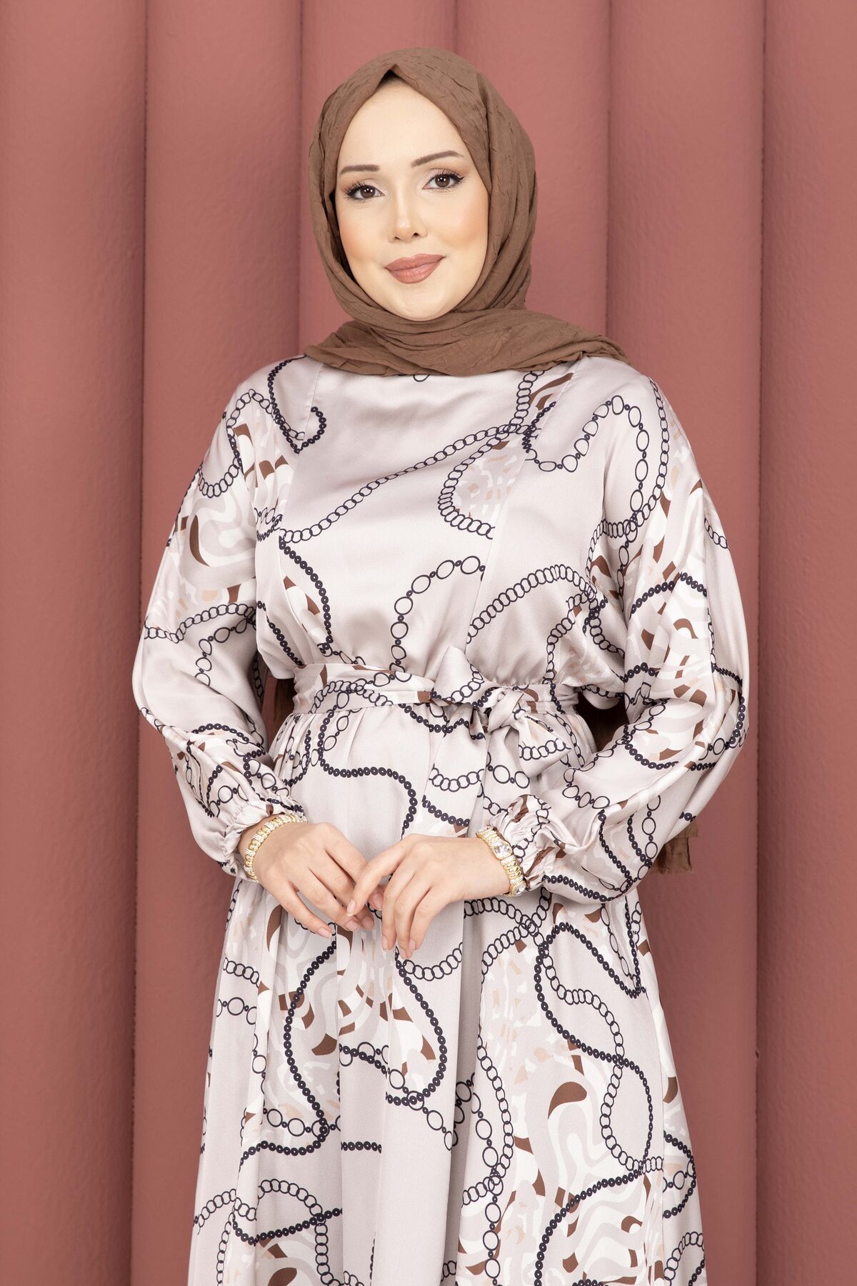 Zincir Desen Kuşaklı Tesettür Elbise Vizon